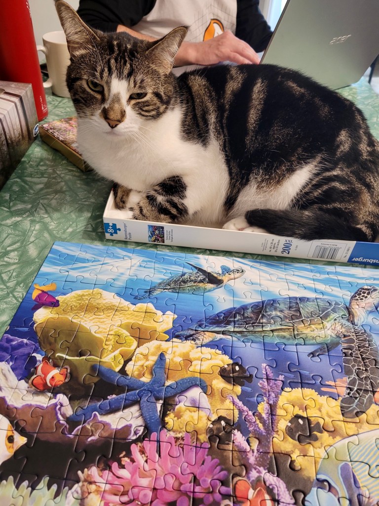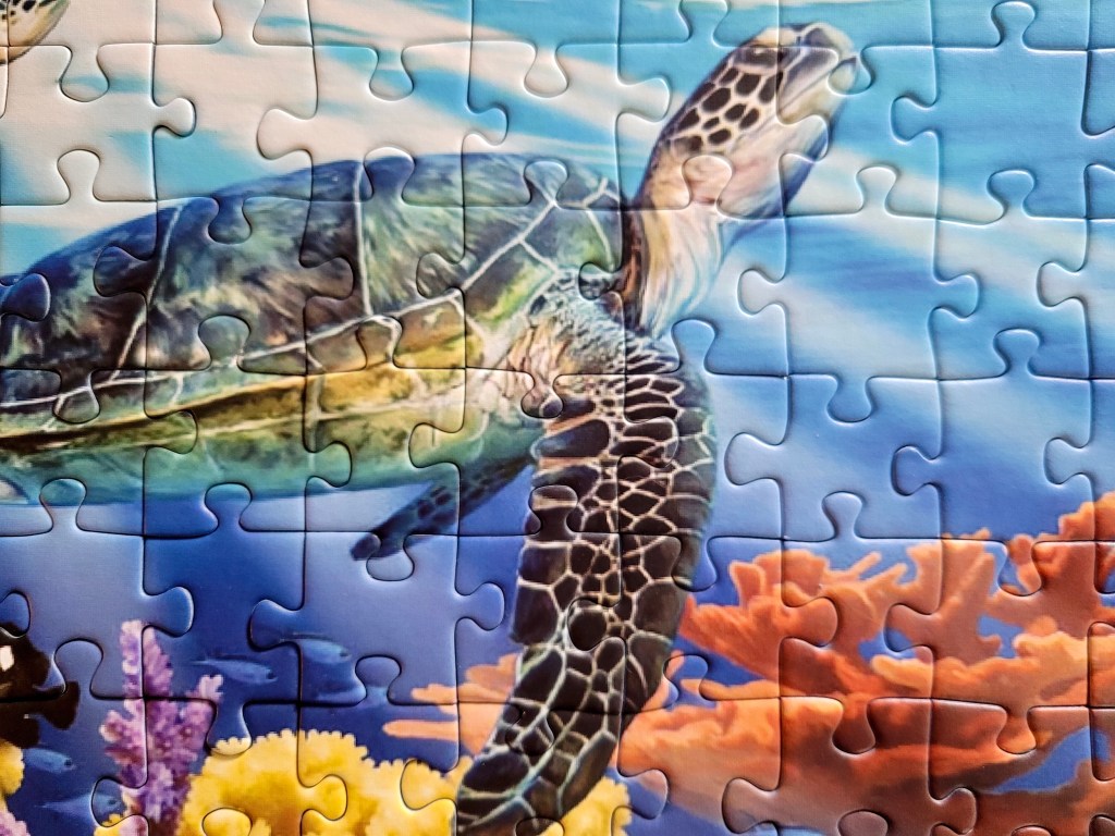 Another puzzle sent to me from Joe’s mom, Ocean Turtles by Ravensburger. Another smaller piece count and another sneaky evening puzzle.
