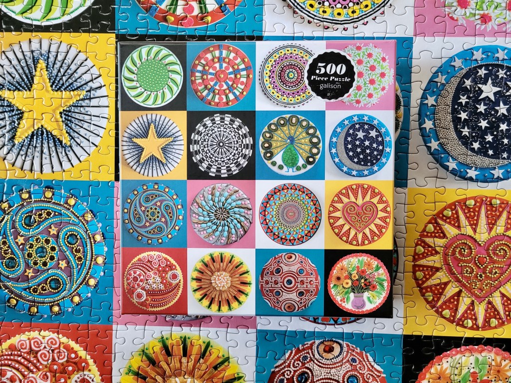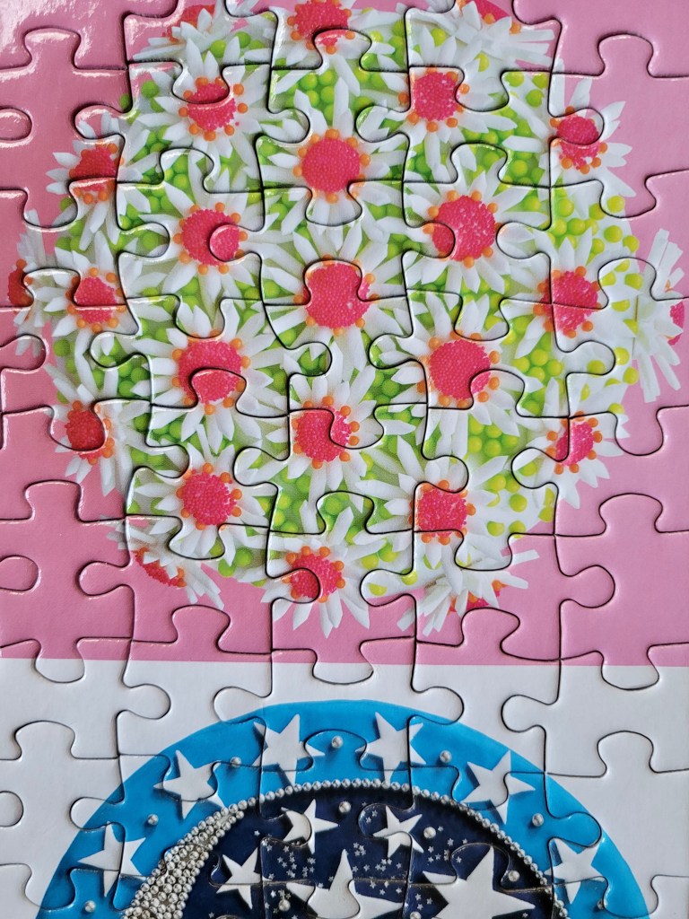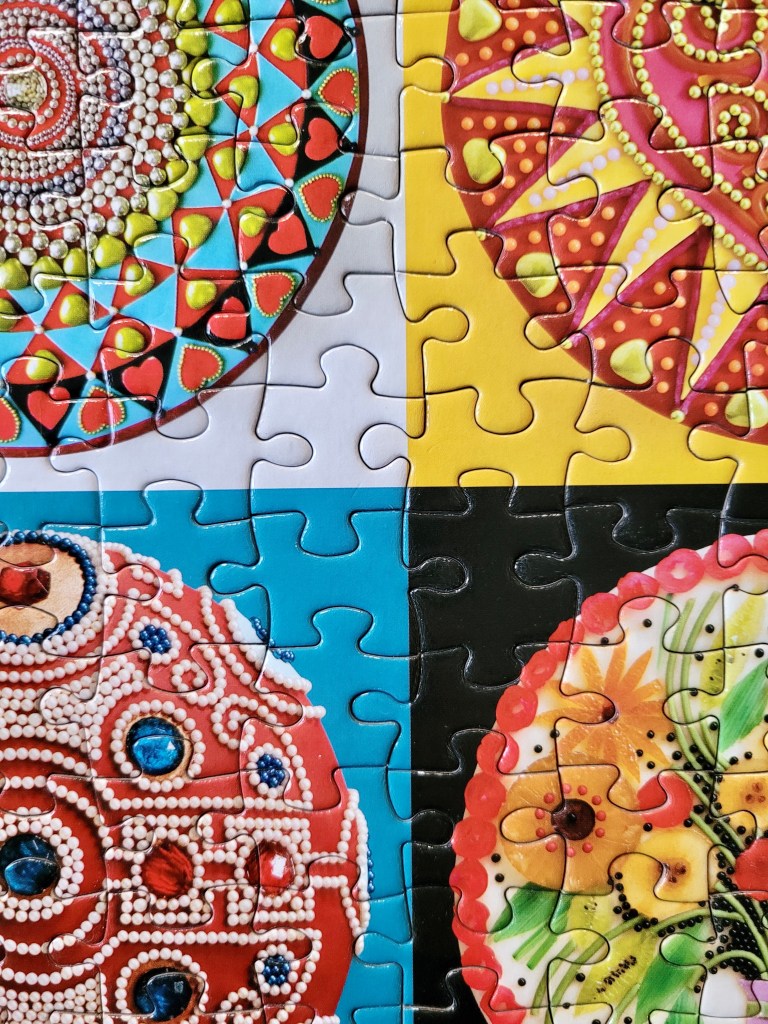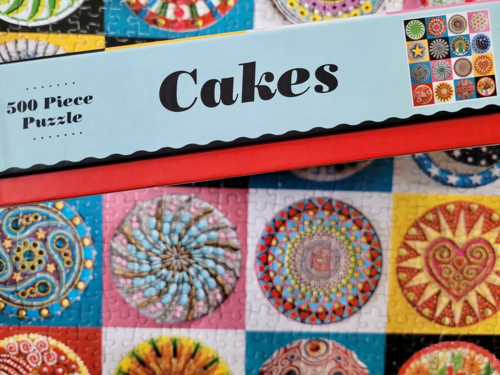 Well, it’s been about a month, but I assembled this puzzle for my birthday, Cakes by Galison. I found this one, not too long ago at the Mission Mart and I grabbed it. I’ve seen it online plenty and always loved the imagery, but being a tile format puzzle, I knew this would be such an easy puzzle, and I typically don’t buy easy puzzles brand new.