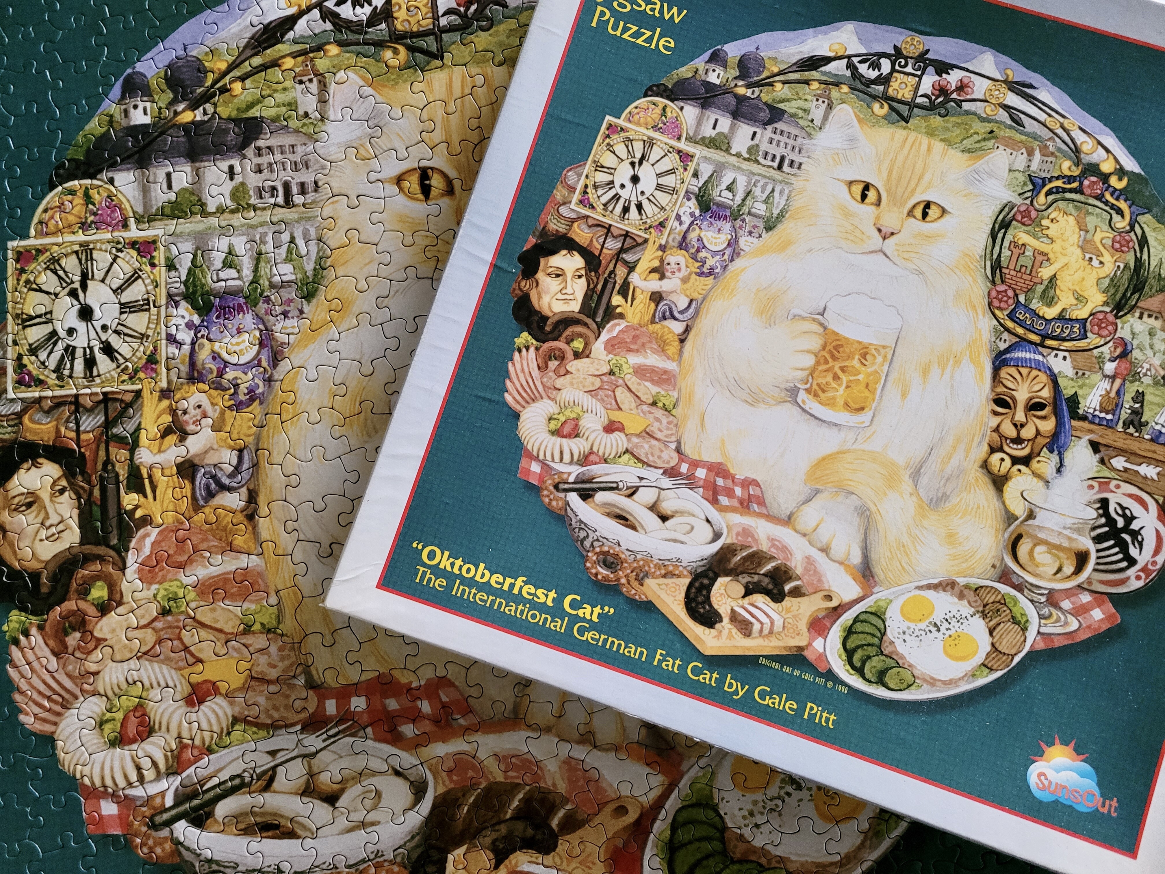 Well, this is a unique find, to say the least, and I’m loving it. This is a 500 piece vintage SunsOut puzzle from 1998, complete, in perfect shape and features the artwork of Gale Pitt.