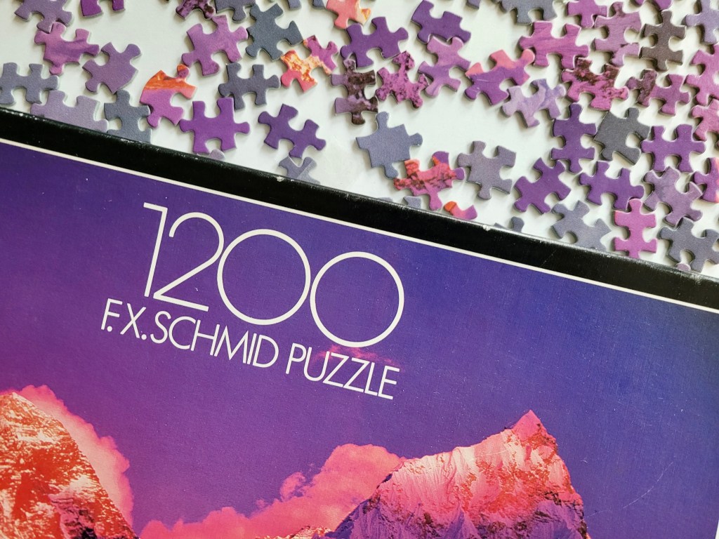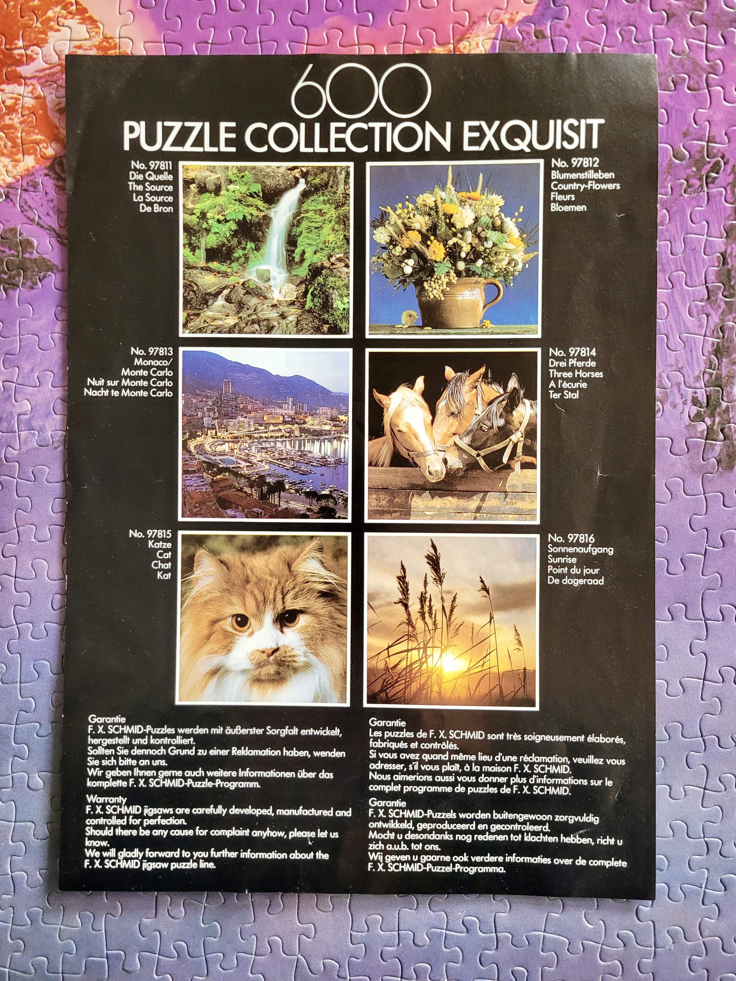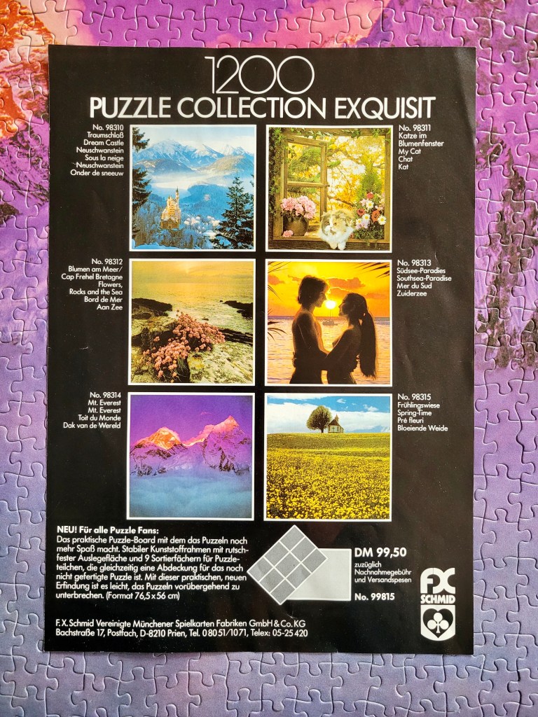 F.X. Schmid, a German puzzle company that was eventually bought out by Ravensburger. I’m fairly certain they acquired the company by 1996, making any found German-made F.X. Schmid puzzles nearly 30 years old at the minimum.