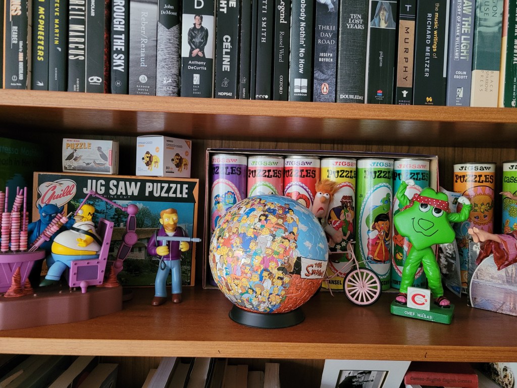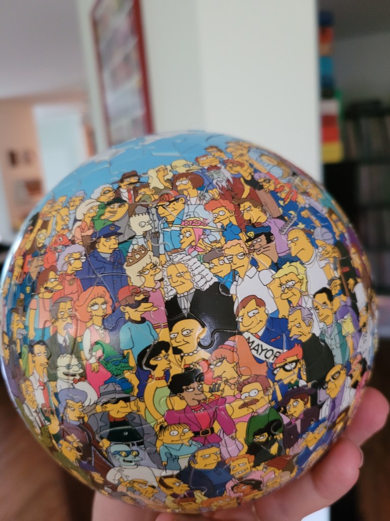 I chose this puzz for the cartoon puzzle along last week. I found this at the Mission Mart and was so intrigued by it, I’d had it for a while and though this puzzle along was the perfect time to pull this out. The whole globe was 240 pieces and the pieces fit in their place with a nice click and snap, the last few pieces didn’t quite snap in so they’re not perfectly flush. I’m sure if I wrestled with it a bit, I could get it to sit flush, but I didn’t want to break the whole globe, so I’ve left it. The brand that made this is RoseArt and it was made in 2005, almost vintage, haha!