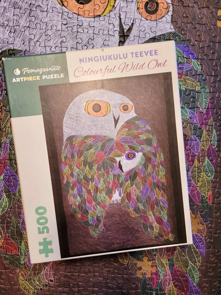Wow, another puzzle that I checked off my wish list at the thrift store! Another Pomegranate too. This moody but energetic owl and its baby, has caught my eye several times on Instagram over the past year or so.