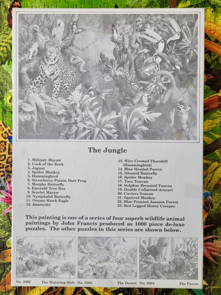 The artist is John Francis and I’m fairly certain that he was the artist behind some of my favourite nature puzzles from James Hamilton. Remember Cats of Mountain, Plain and Desert, I did spot his signature at the bottom right corner!