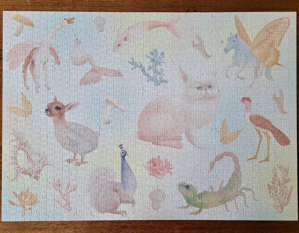What possessed me to buy this puzzle? I think I was really excited at the thought of finding a Cloudberries puzzle again at the thrift store. I overlooked the image (which I think is really weird and frankly gruesome).