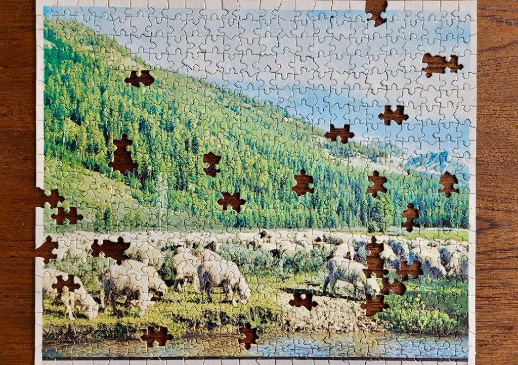 I count 28, not the most incomplete puzzle I’ve ever had, not the least either. This puzzle reminds me so much of the puzzle that my friend Janet found in her apartment she had lived in for 20 plus years, it was tucked away in a closet she was cleaning.