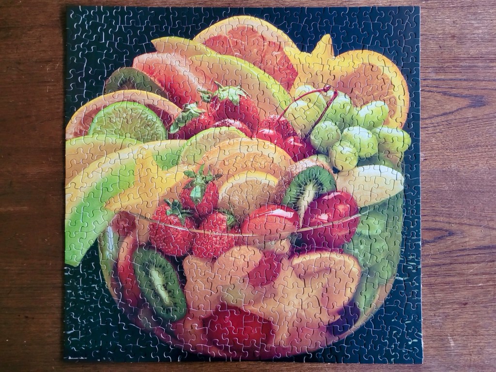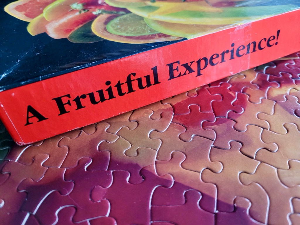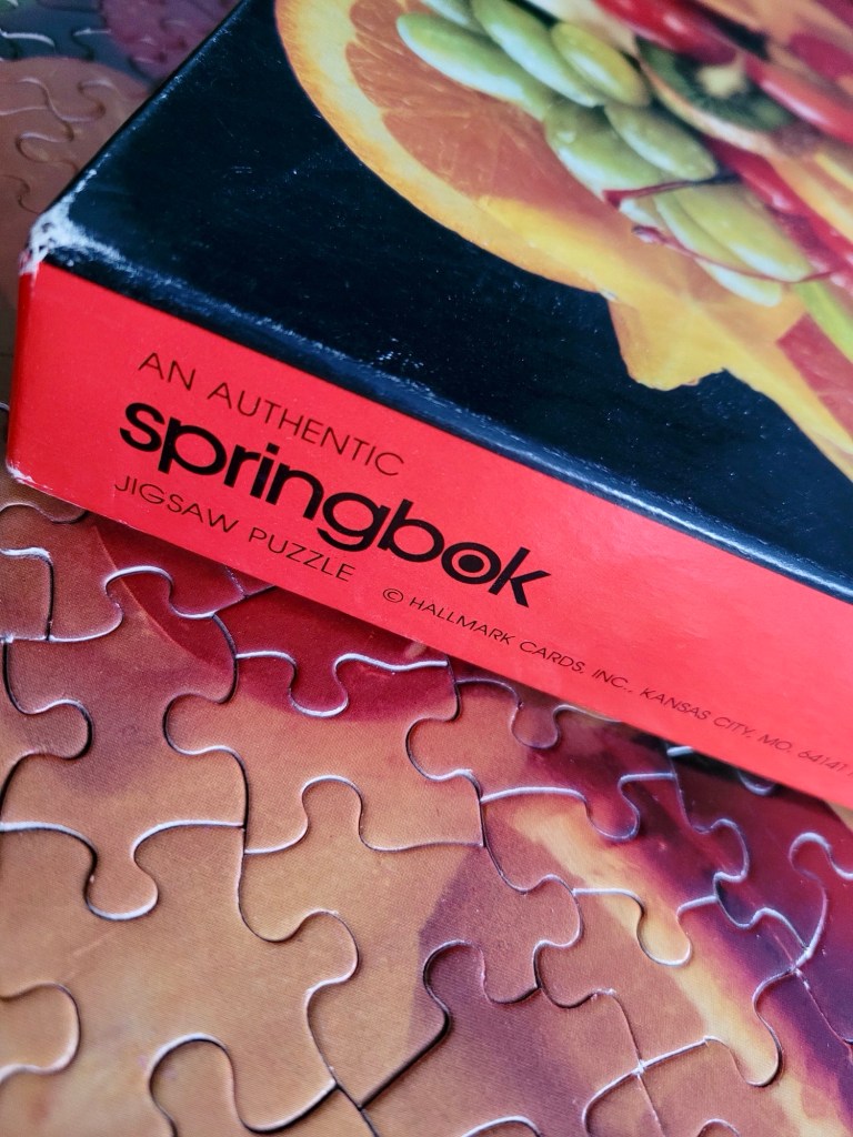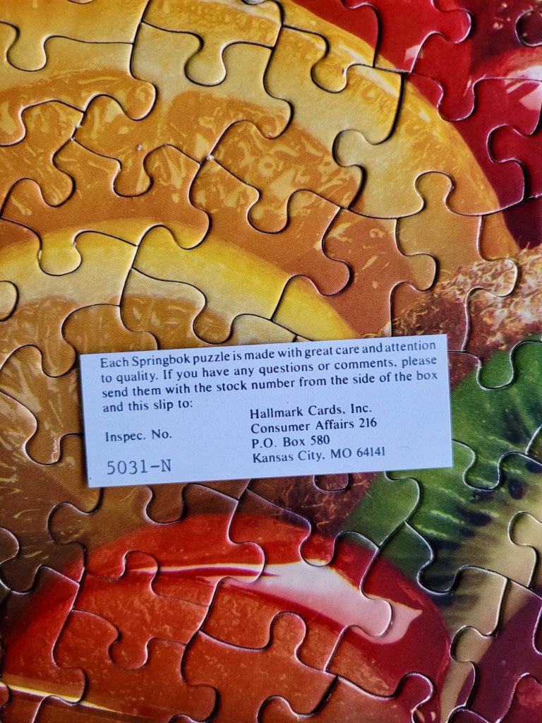 I found another copy of Springbok’s A Fruitful Experience! from 1985. If you’ve been a friend of this blog for a while, you may remember that back in 2016, the year that I began writing blog posts about thepuzzlesivedone, I had a copy of this puzzle, it was missing 10 pieces.