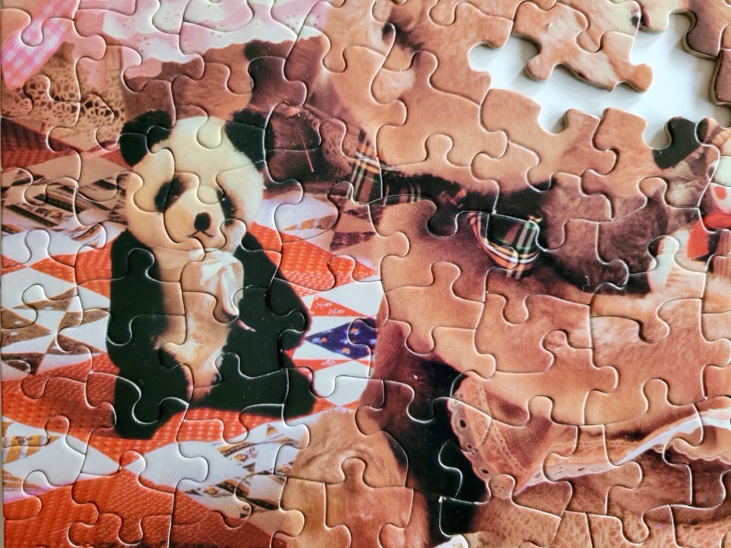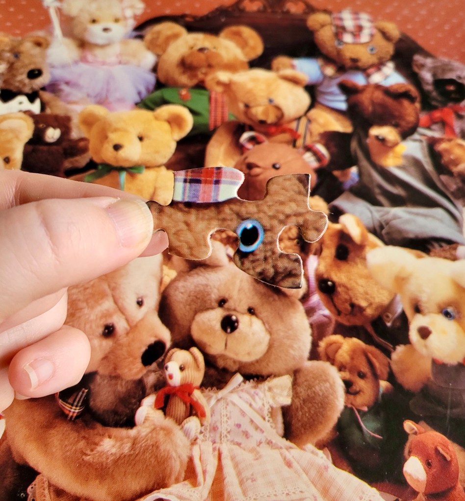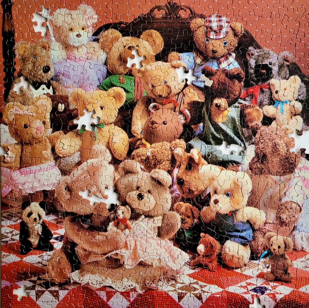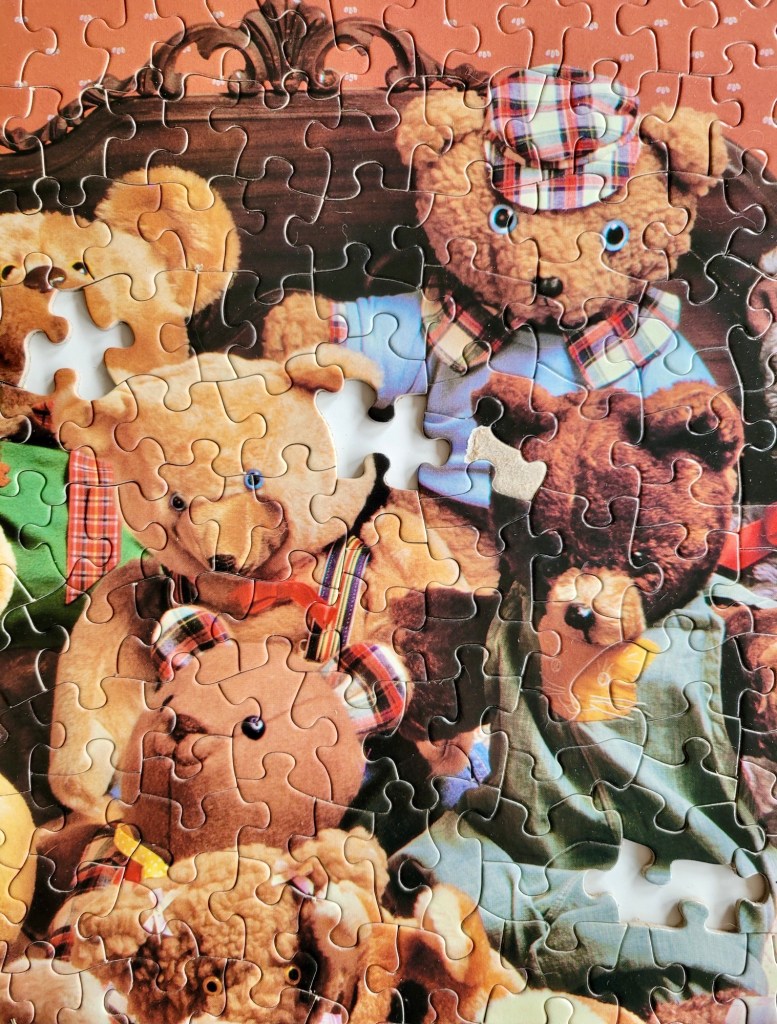 I couldn’t help myself! We have a vintage Springbok from 1983, of a whole bunch of teddy bears in various fancy outfits, and it’s called Best of Friends. I don’t know if it could be any more kitschy classic Springbok than this.