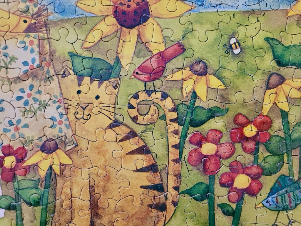 If there is a puzzle image out there that is more 1990s Cottage, farmhouse out there, I’d like to see it! This cutesy little 550 piece puzzle depicting a scarecrow, a cat friend, flower pals and a happy sun shining its rays over the scene is painted by an artist named Debi Hron.