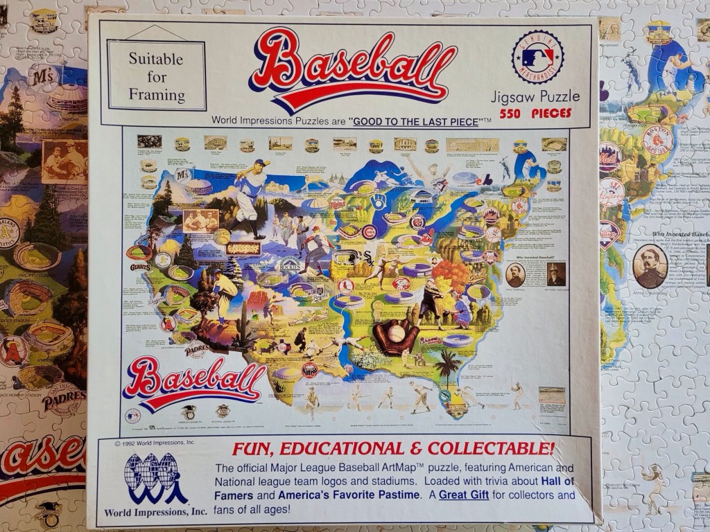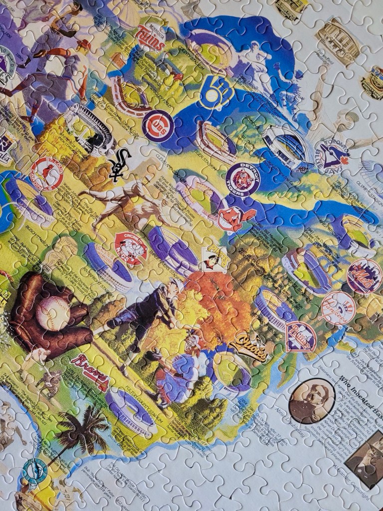 The man loves Baseball, and maps, so honestly this was kind of the perfect puzzle for him. To think I almost didn’t buy this, (the box was so dirty, and it kind of looked like mold. It was actually just caked on dust and Joe convinced me to buy it).