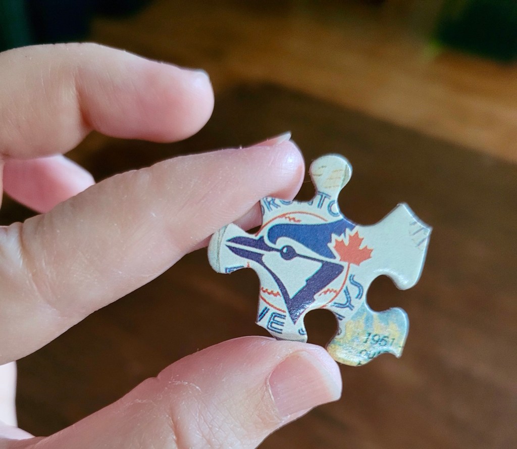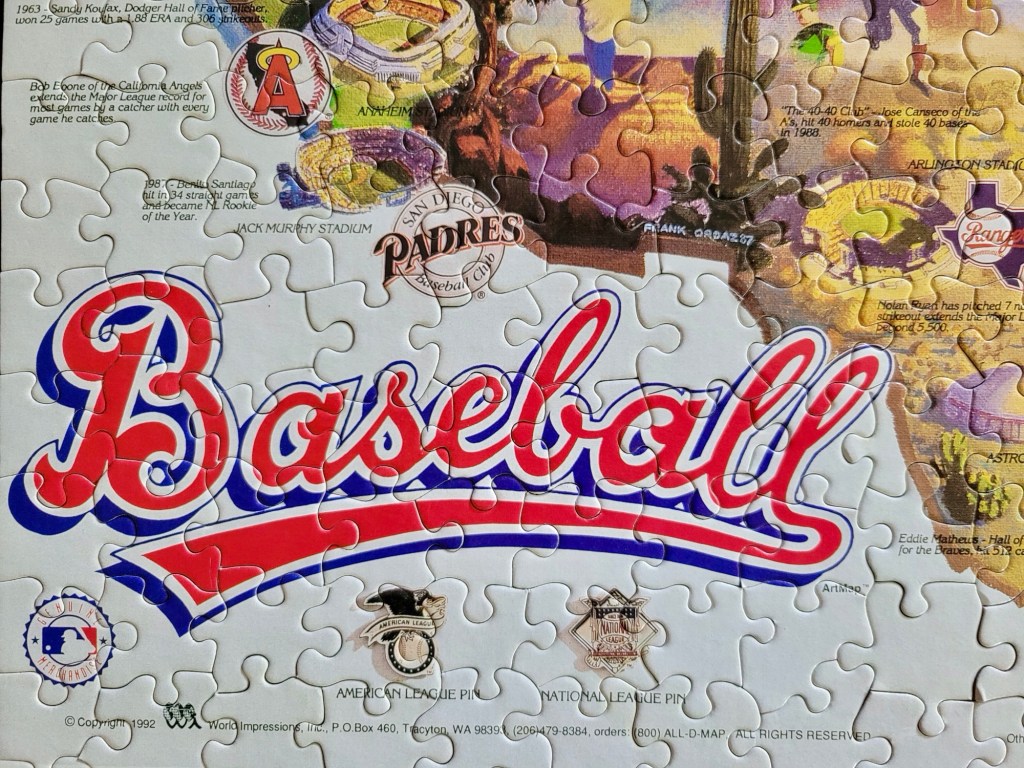 The brand is World Impressions Inc. and it was pretty great. It was a cross between White Mountain puzzles and NorDevCo, which is a pretty good mash up, if you ask me. This was made in 1992, the year that the Blue Jays won the World Series, (I think! I do listen to when Joe talks about baseball, but I may have gotten that mixed up, let me know in the comments!)