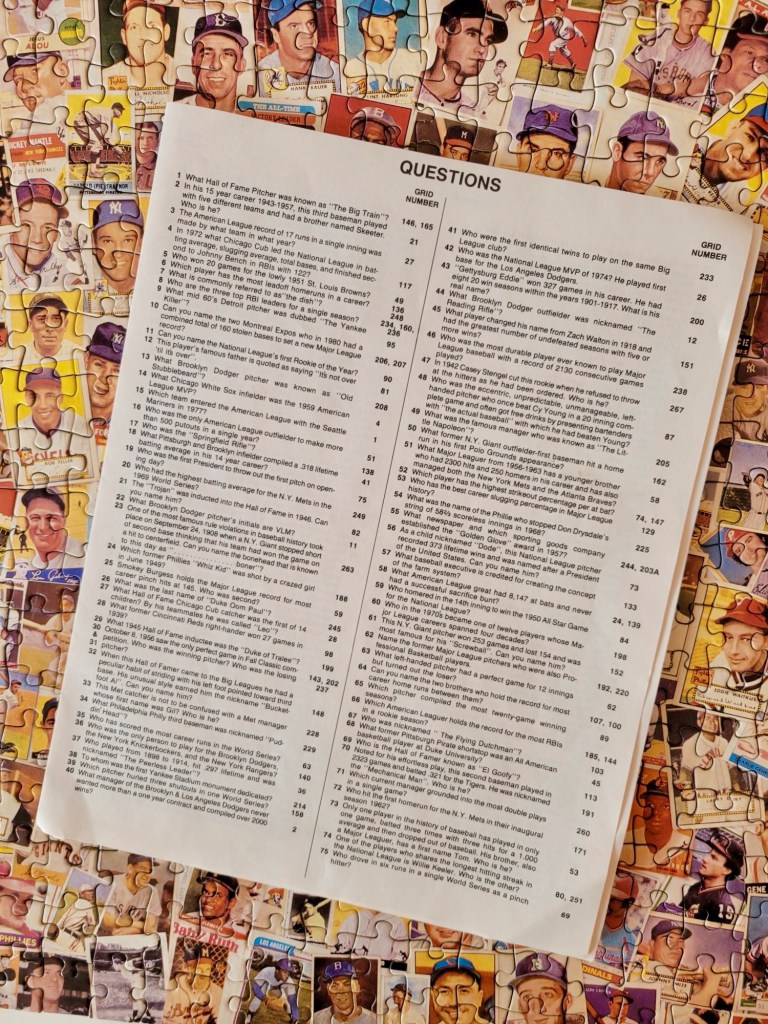 I assumed that it was going to be a really hard puzzle because I took a look at the pieces a few months ago when I got this from a friend. The entire front of the box is obscured by baseballs, because this is meant to be a trivia game as well!