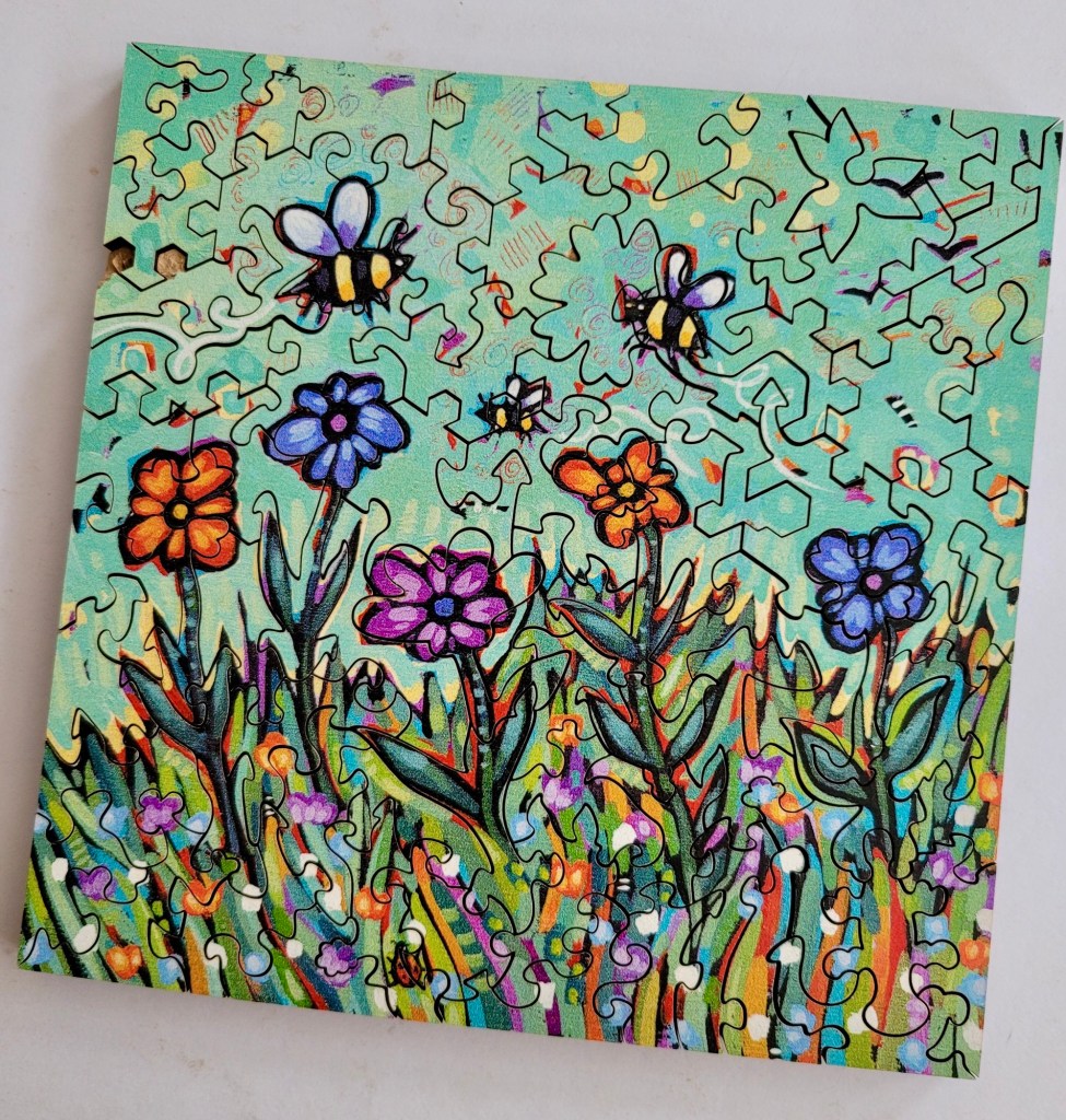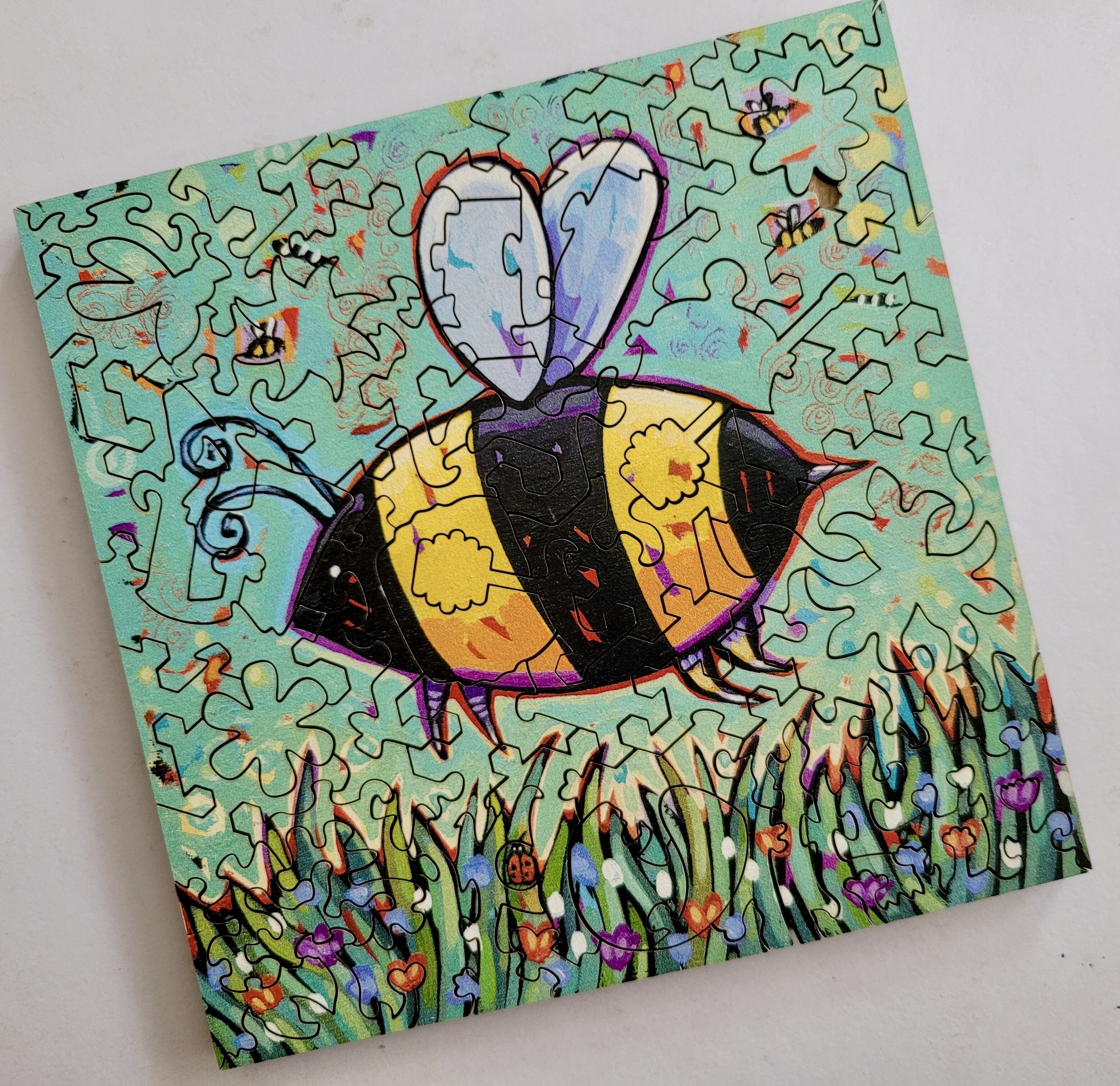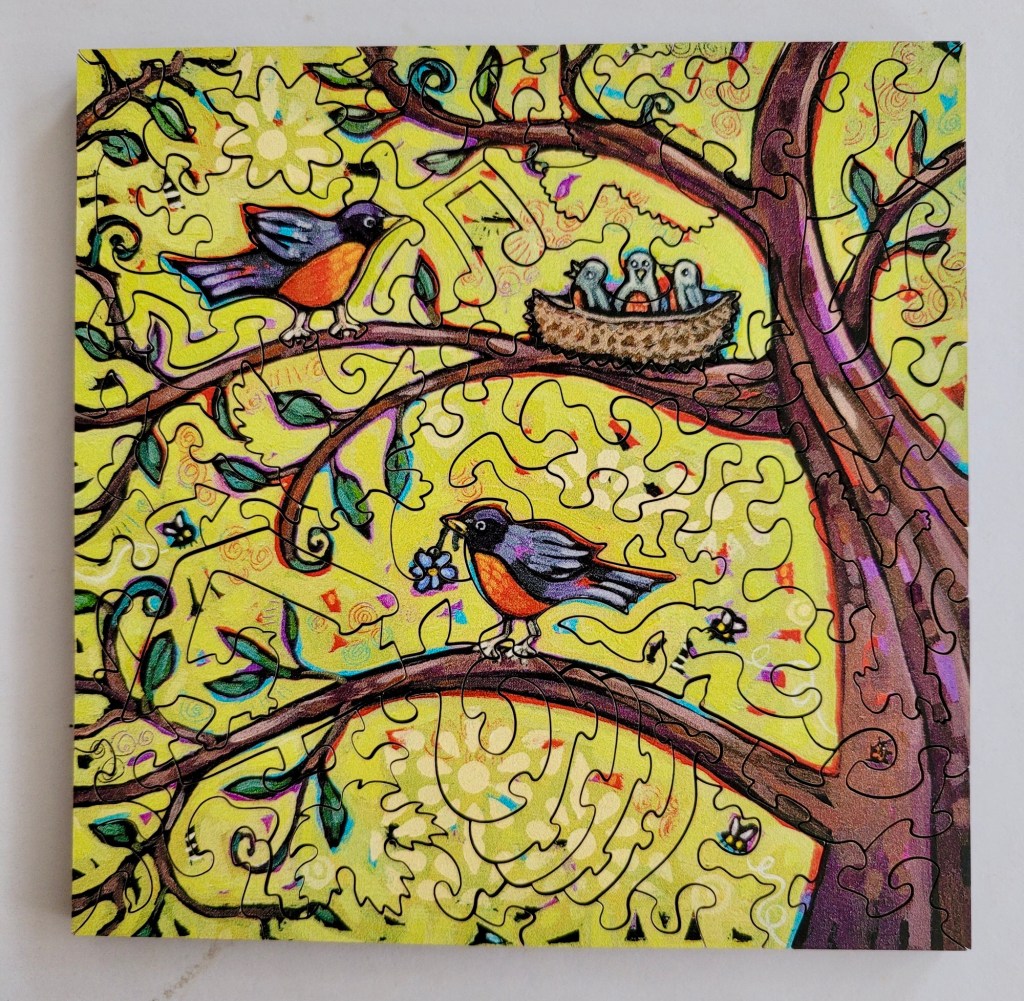 This one, called Birds and Bees by an artist named Pam Weber, was actually four individual puzzles. Of, well, birds and bees! I tried to get in nice and close so the cut of some of these was visible. There were fun honey, and vine-like floral motifs to the cut of this puzzle. It’s just that extra detail that makes these so nice.