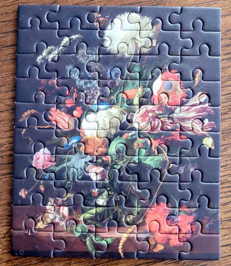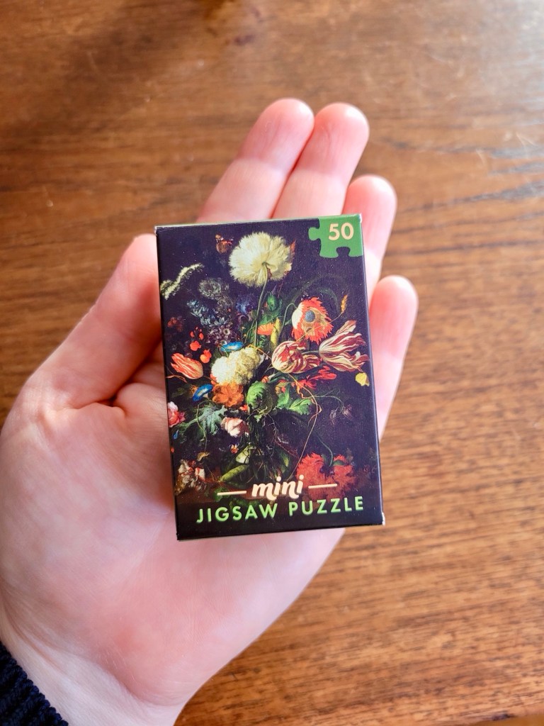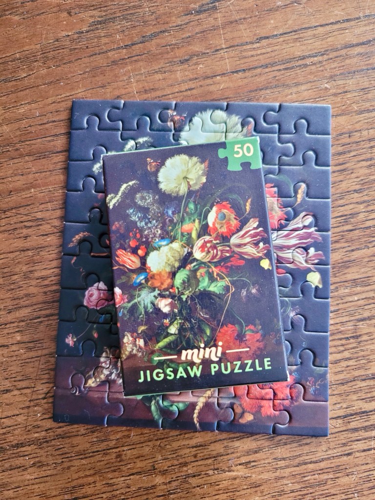 50 pieces, brand new and very sweet. So mini that it reminded me of a past stocking stuffer from Joe, Mini Bird Puzzle.