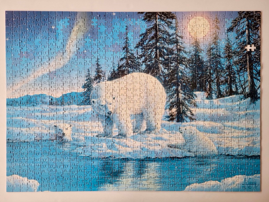 The puzzle glowed pretty well, it kind of resembled moonlight hitting the water, snow and the bears. It was really pretty. It glowed well, but it didn’t last that long, probably because this puzzle is 25 years old! Also, my camera didn’t pick up any of the glow, so take my word that it was cool.