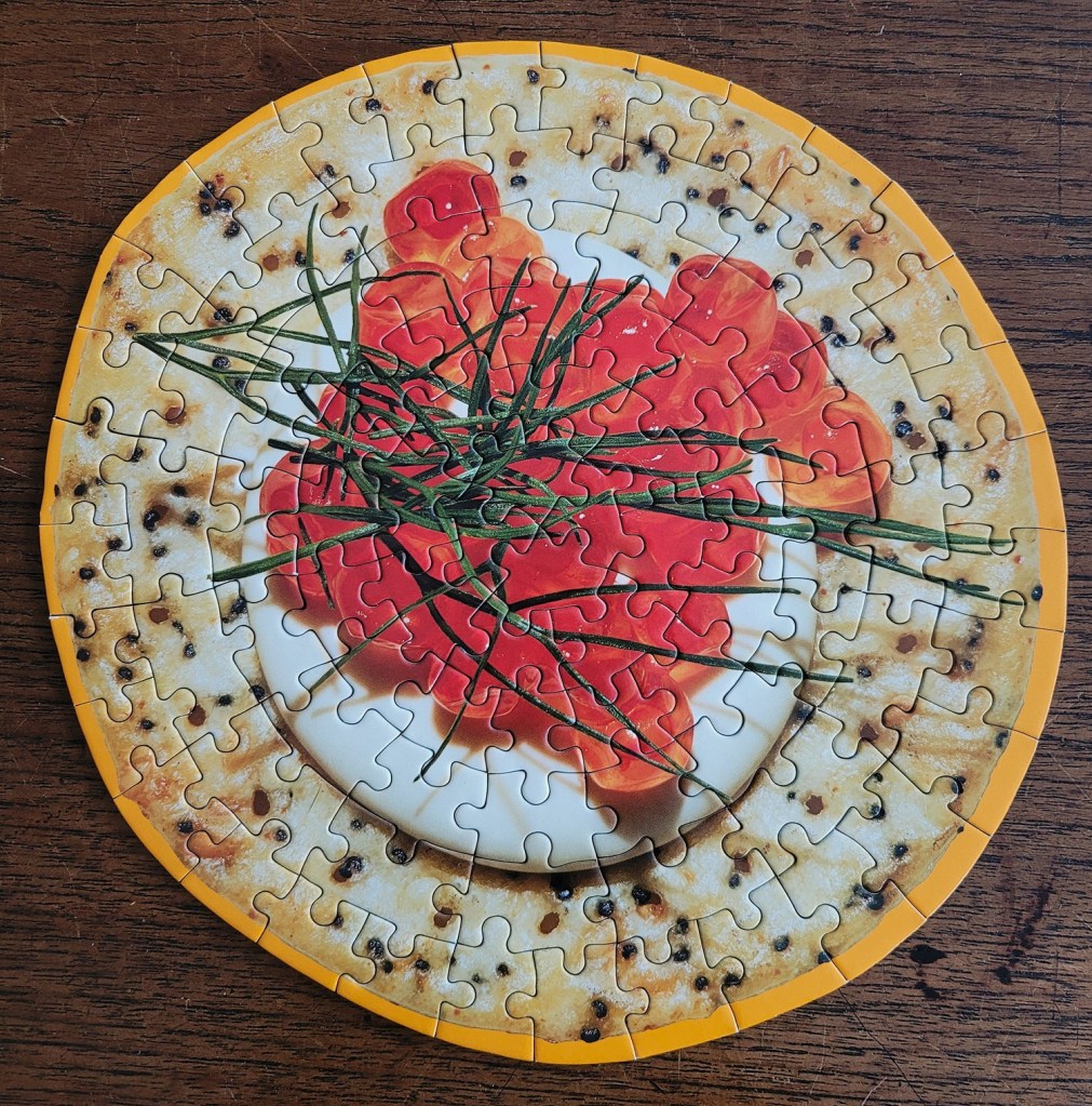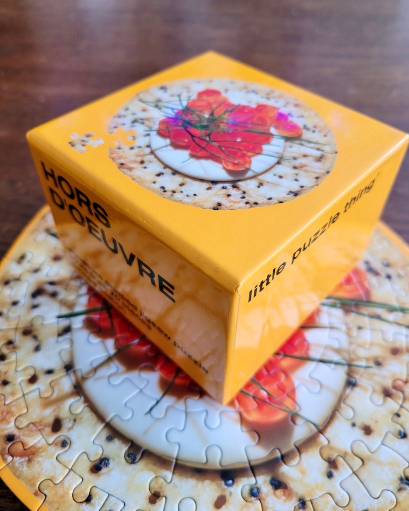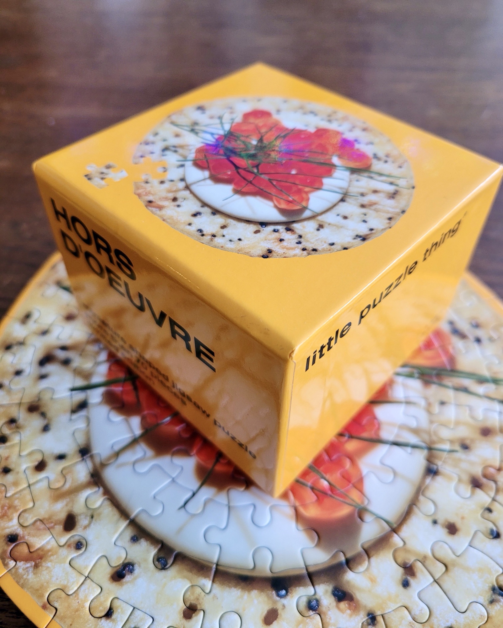 Hors D’ouvre anyone? I think my readers know that I very much enjoy these quirky Areaware mini puzzles of food. this one is from a Party collection, note the adorable party sticker collection that comes with the puzz.