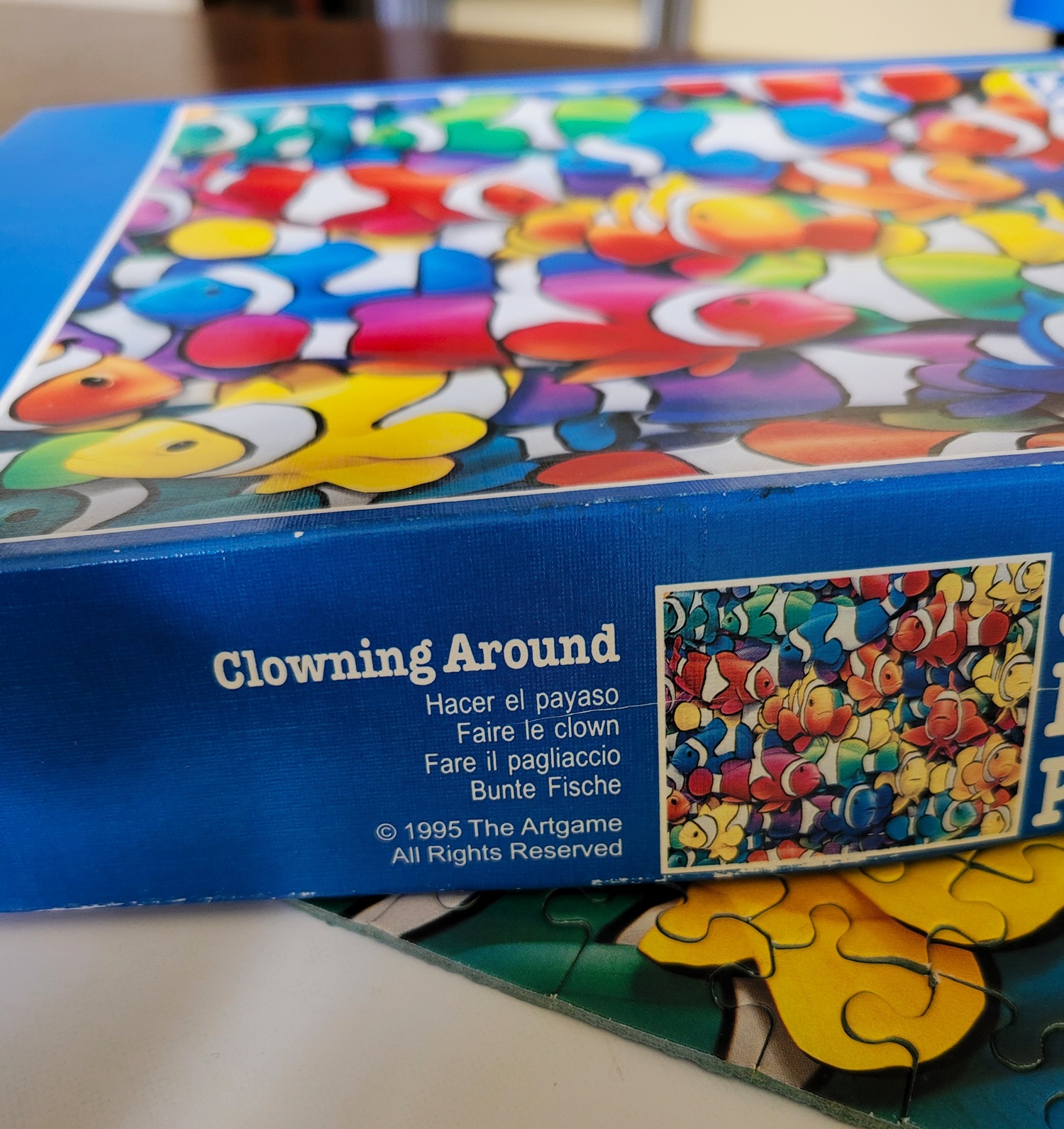 A 1995 release called Clowning Around by F.X. Schmid, featuring a school of clownfish. What else would you expect? This was honestly a great choice for my first puzzle, because the finished puzzle was actually quite small, everything of ours was still just laying around everywhere so having just one foamboard out was perfect. It fit both the pieces and the full puzzle.