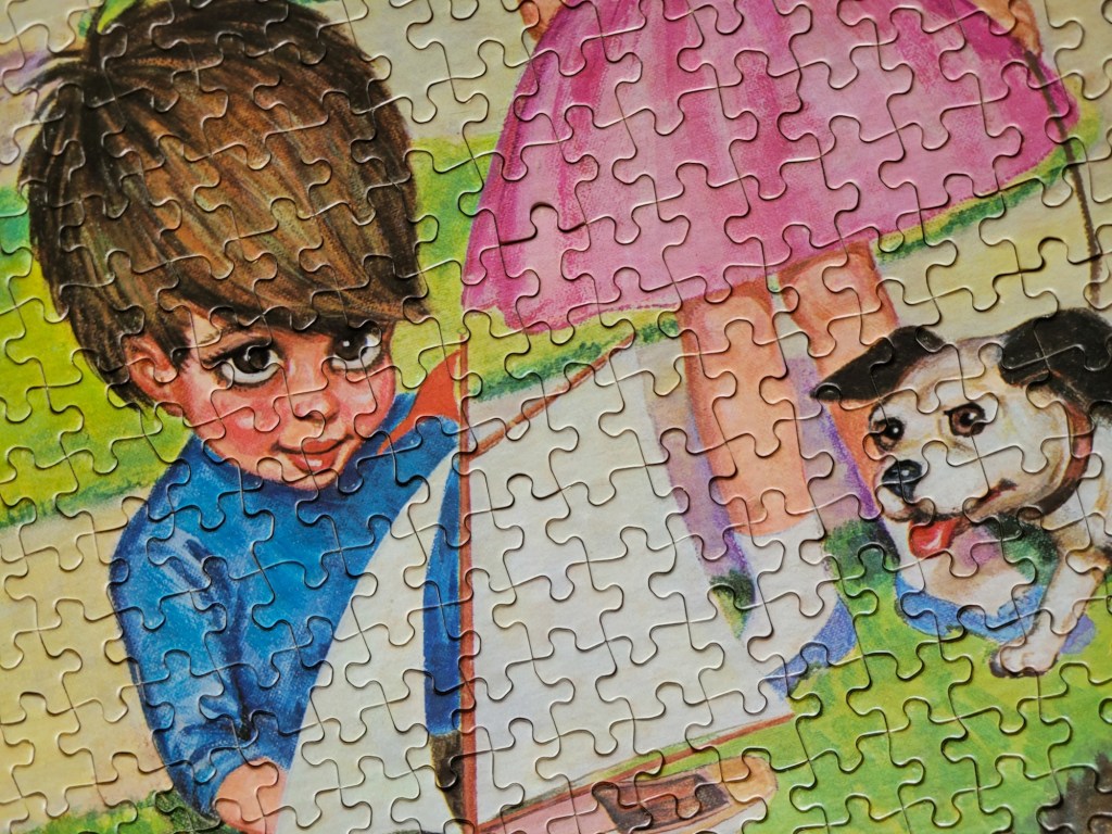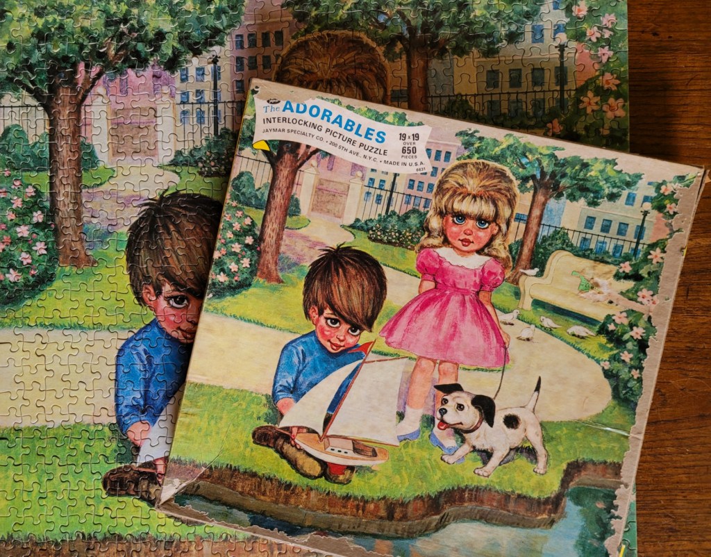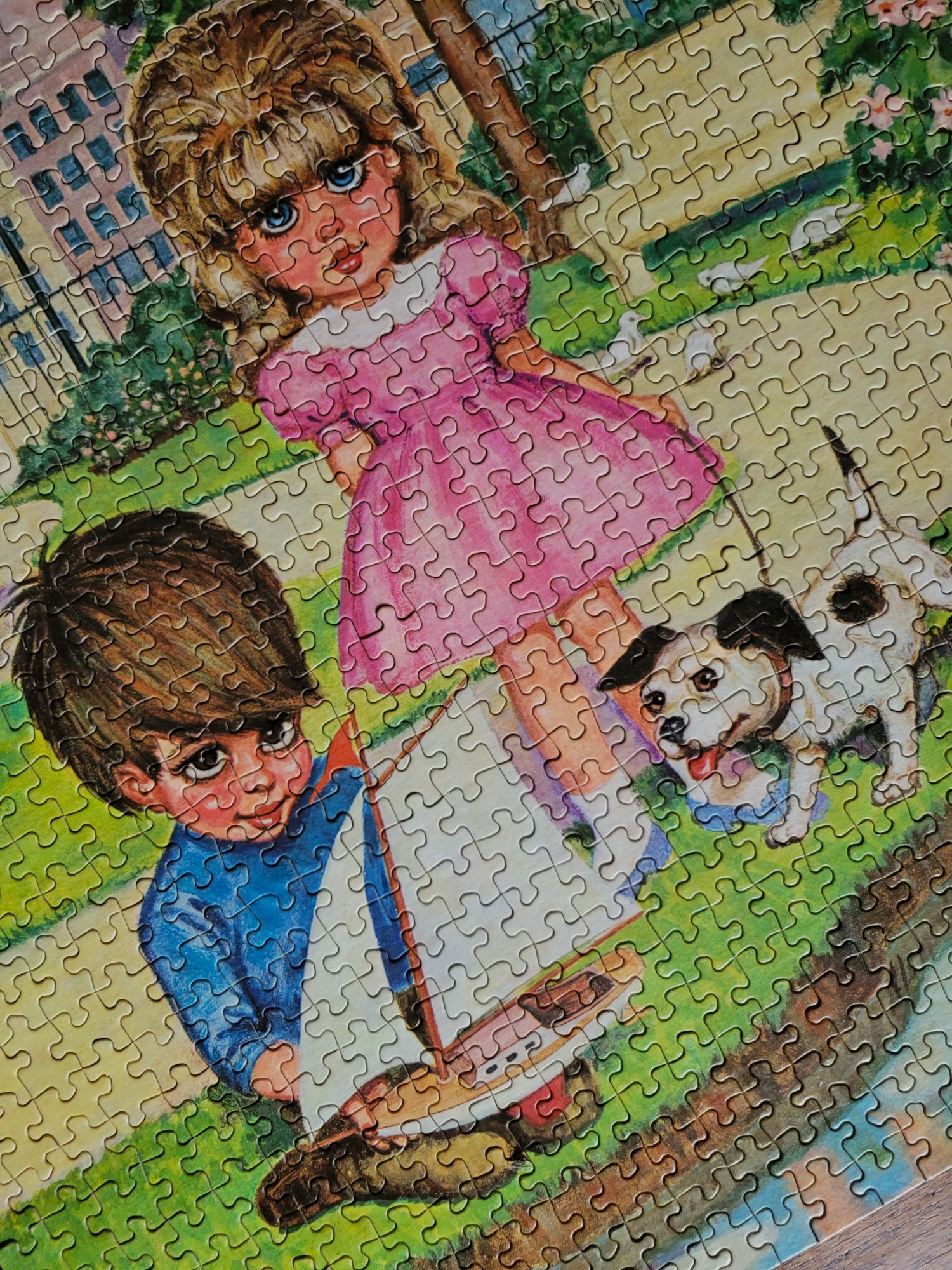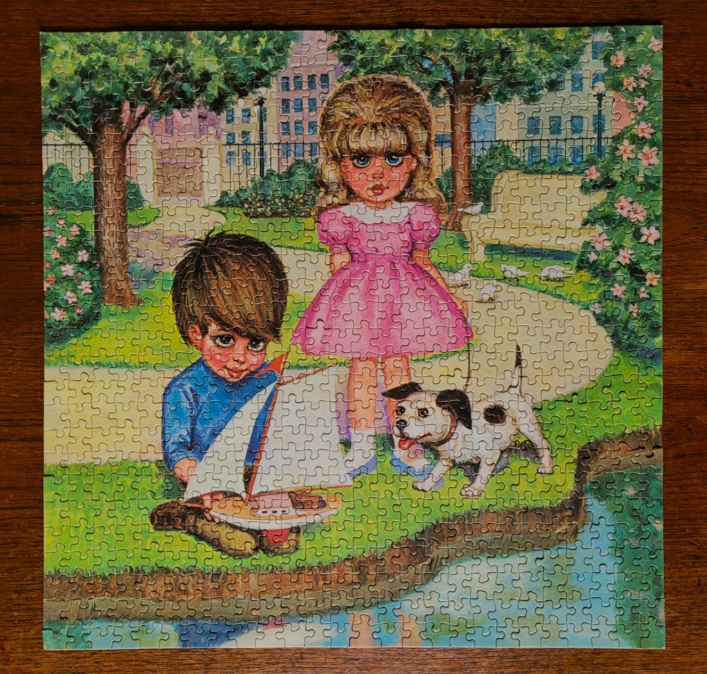 This is a Jaymar puzzle from a line of theirs called “The Adorables” I’ve seen one other puzzle from this series online, it features the same boy but a different girl and dog, (which fits my Pennywise theory!) The other image is of the two kids in a rowboat and the boy is looking at the painter head on with the exact same expression, it’s definitely very sinister!