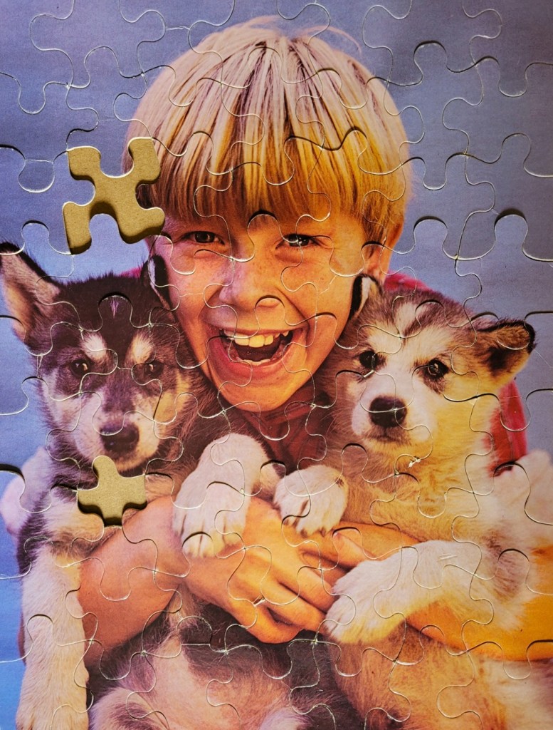 I just love a vintage puzzle that showcases someone’s love and excitement for cute fuzzy animals. This little kid with two adorable husky dog puppies is so happy to be holding them and taking this photo. It’s just the sweetest, and the true love and excitement just shines in this picture.
