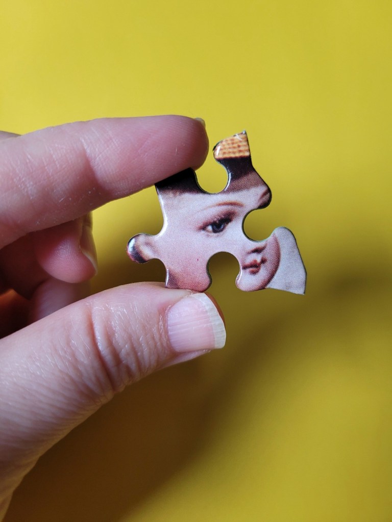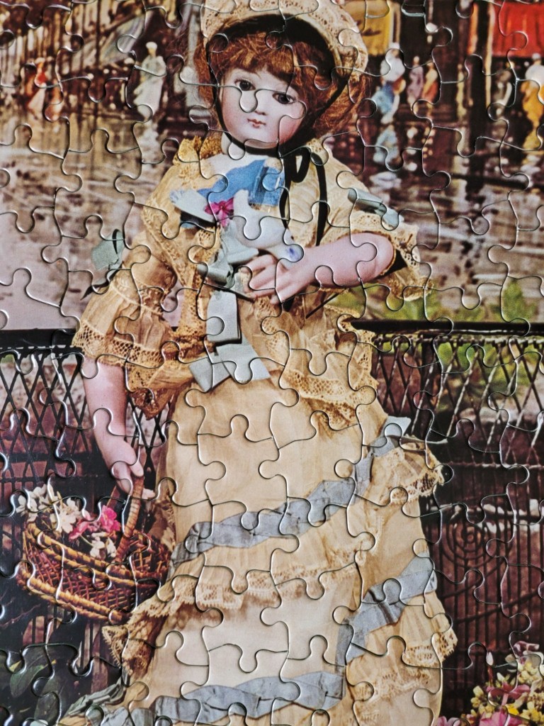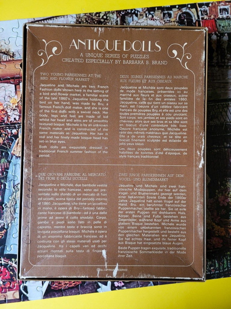 This charming little puzzle image is one from a set of four 300 piece puzzles created for Waddington’s by Barbara Brand that features antique dolls. Each puzzle from the series have the reference number 512 and are listed in the Spring 1975 Waddington’s catalogue.