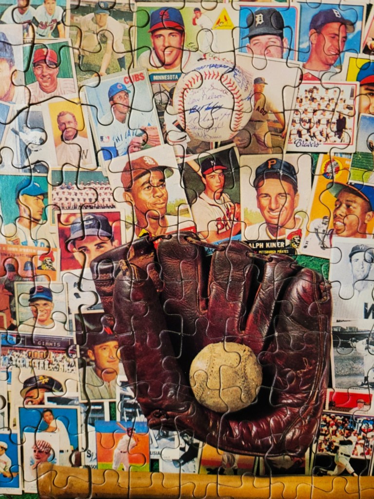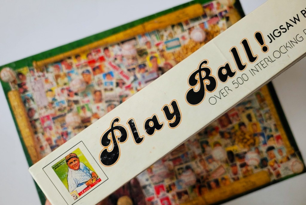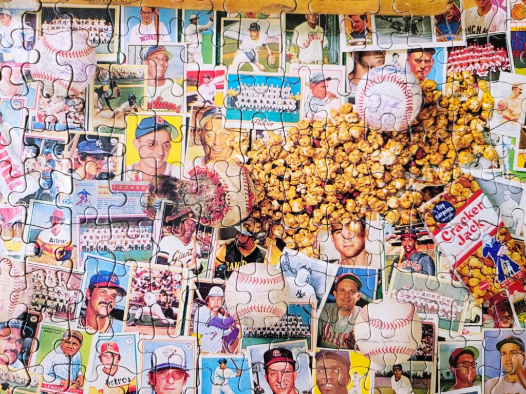 For instance, the baseball glove, the pile of peanuts, and Cracker Jacks, and the baseballs scattered throughout the image. these made for a lot more clues during the puzzling. Honestly, this puzzle is kind of perfect, if you like a baseball card image, that is. 🙂