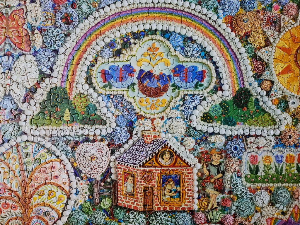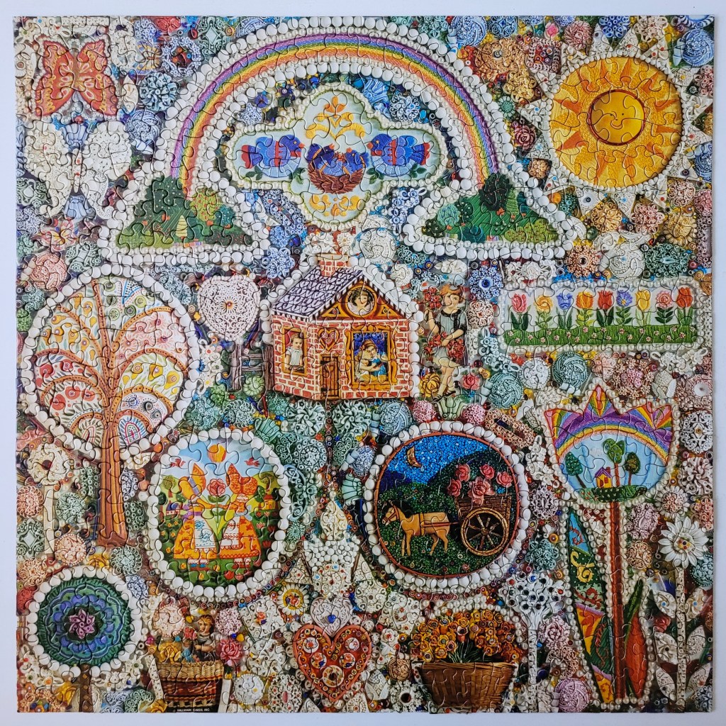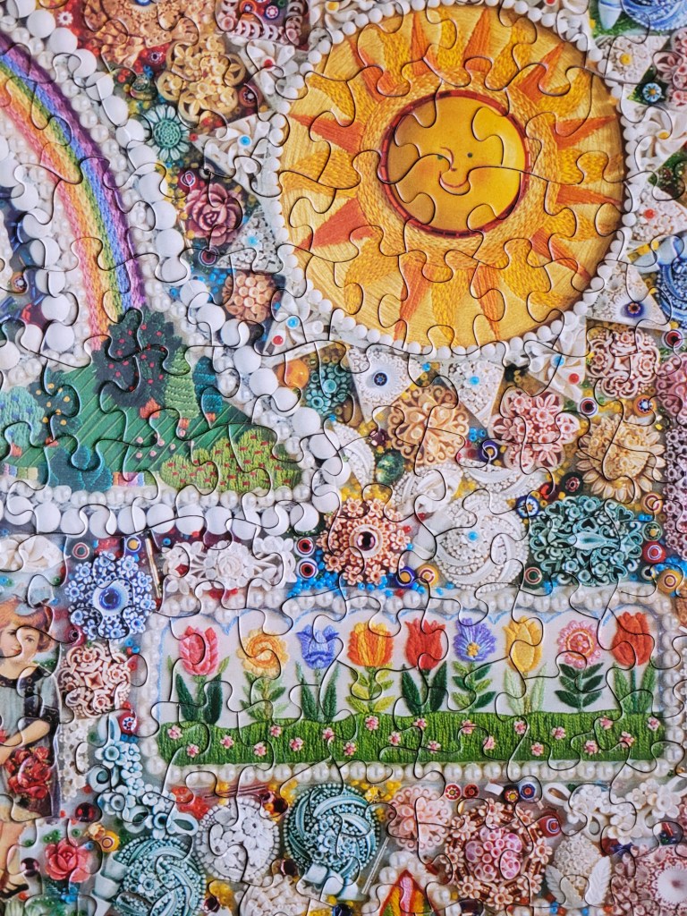 I just love the attention to detail in this image, the colours and little bits of embroidery and beadwork are so stunning, I just love how it all comes together to make the most cohesive collage image. It’s truly so beautiful. The artist is Bob Schneeberg, the artist that brought us A Merry Old Christmas. I found that one a while ago at a local vintage market here in Halifax, as a matter of fact I’ll be hosting a vintage booth there this weekend, selling some of my special vintage puzzles and sharing the love of a good puzz.