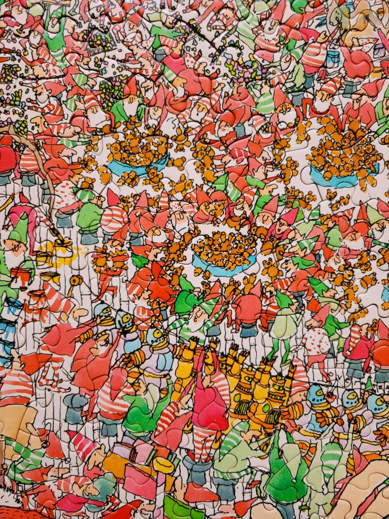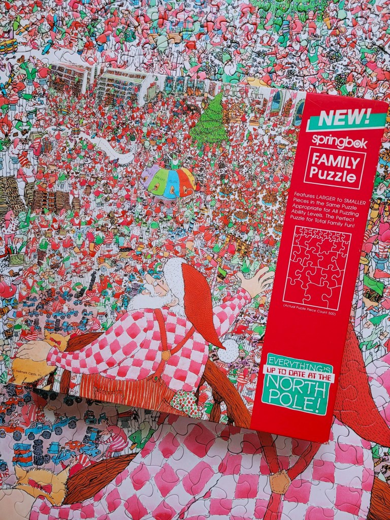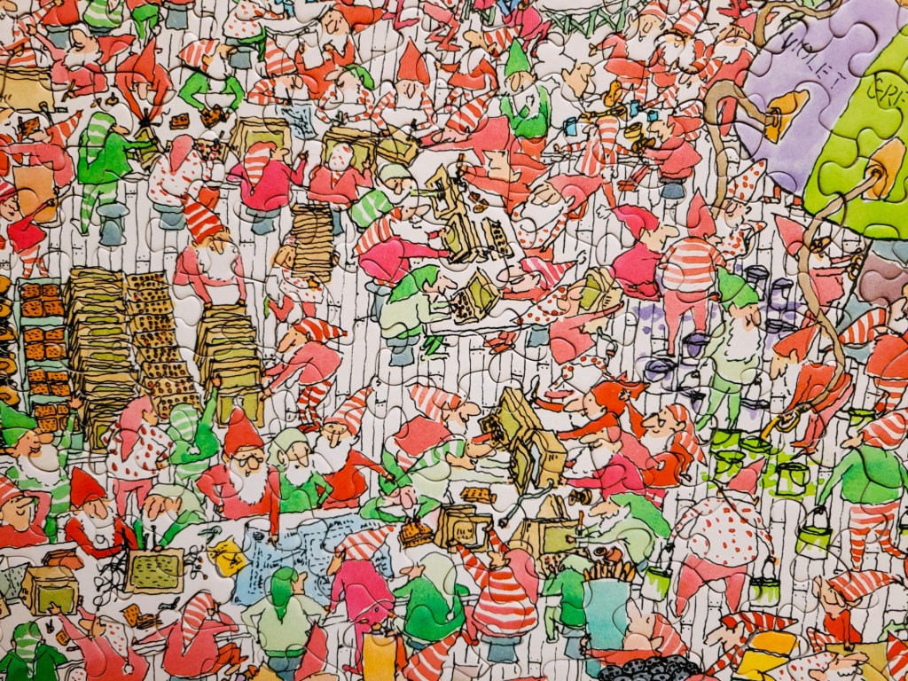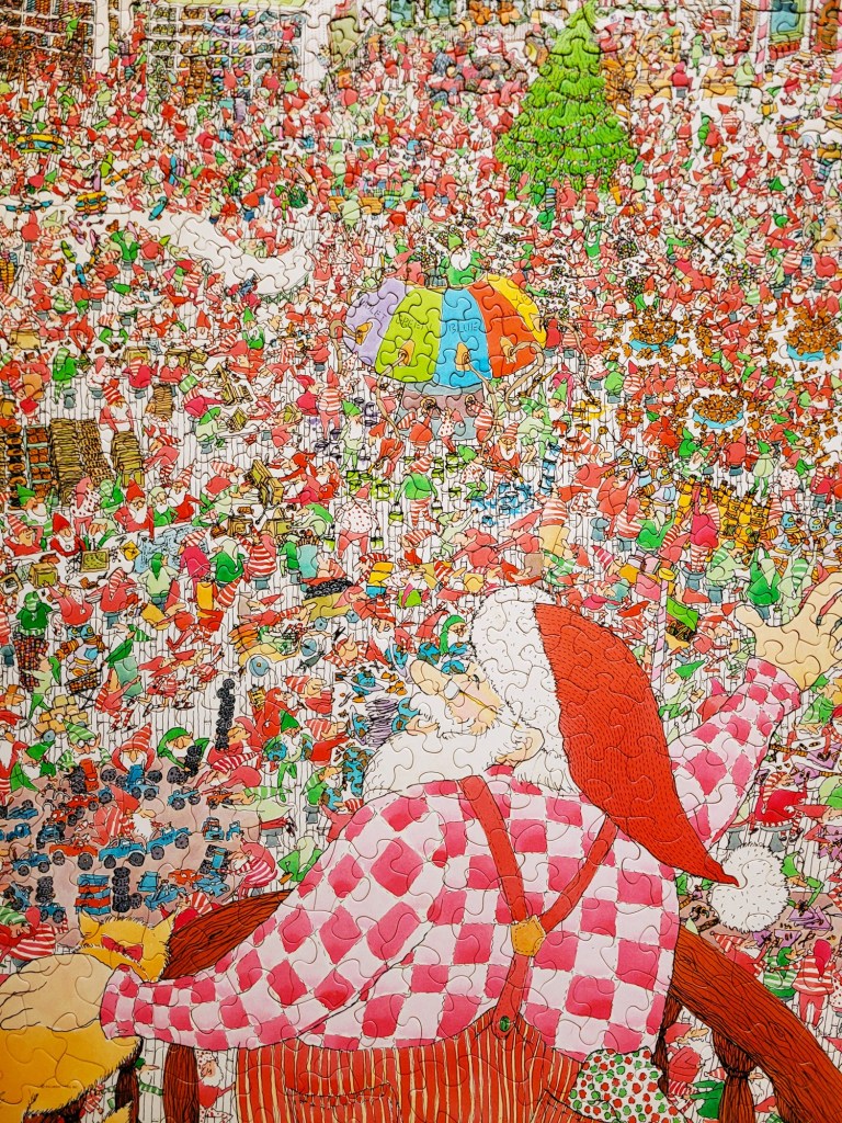 This is a Springbok Family puzzle, just like my Snoopy’s Holiday Greetings puzzle from a couple weeks ago. The pieces at the bottom were large, which would be perfect for kids, and they got a whole lot smaller up at the top. Did I slow down? You bet. But I really enjoyed this layout and the finished picture was so fun to stare at and look at all the wacky details.