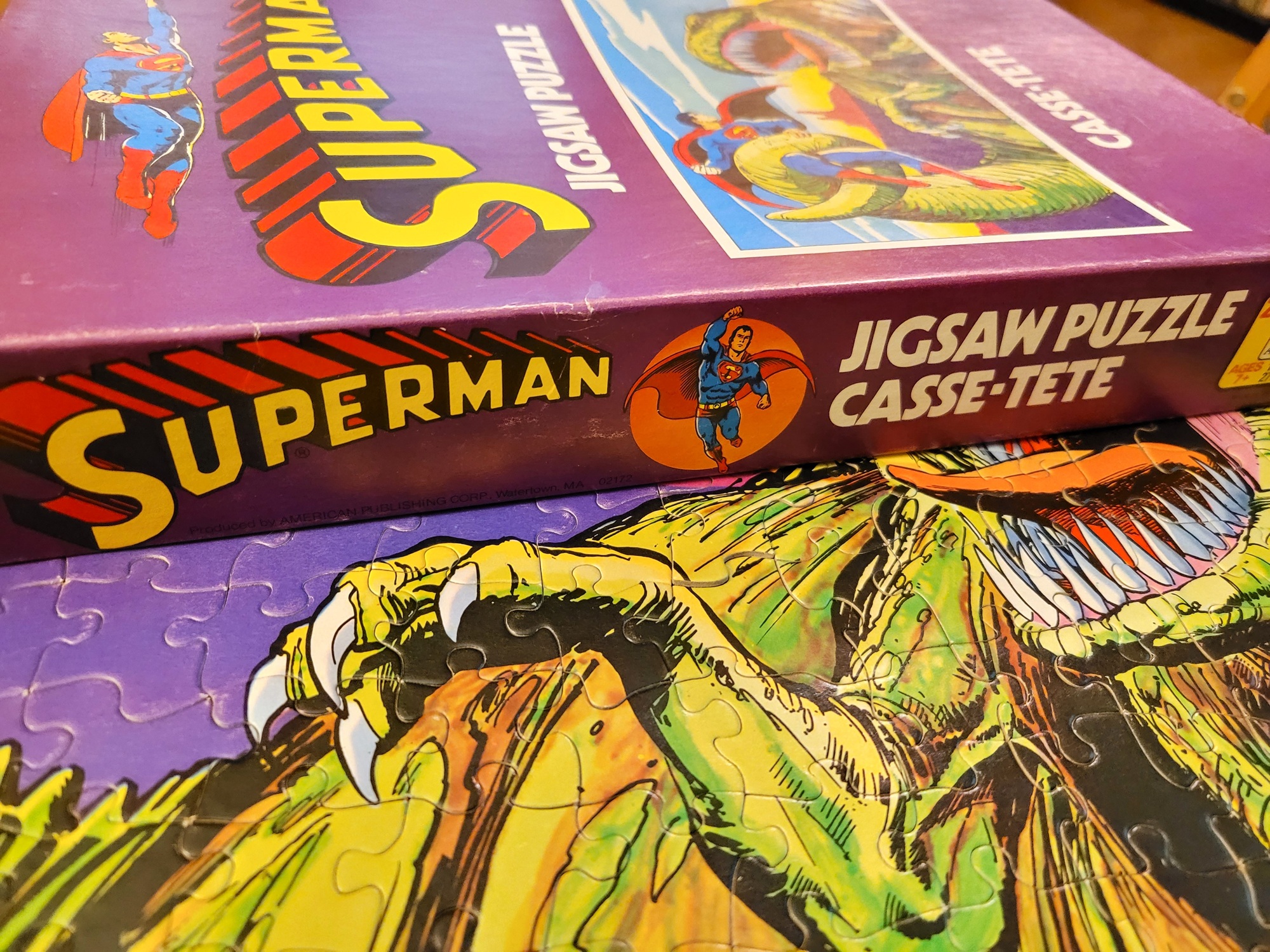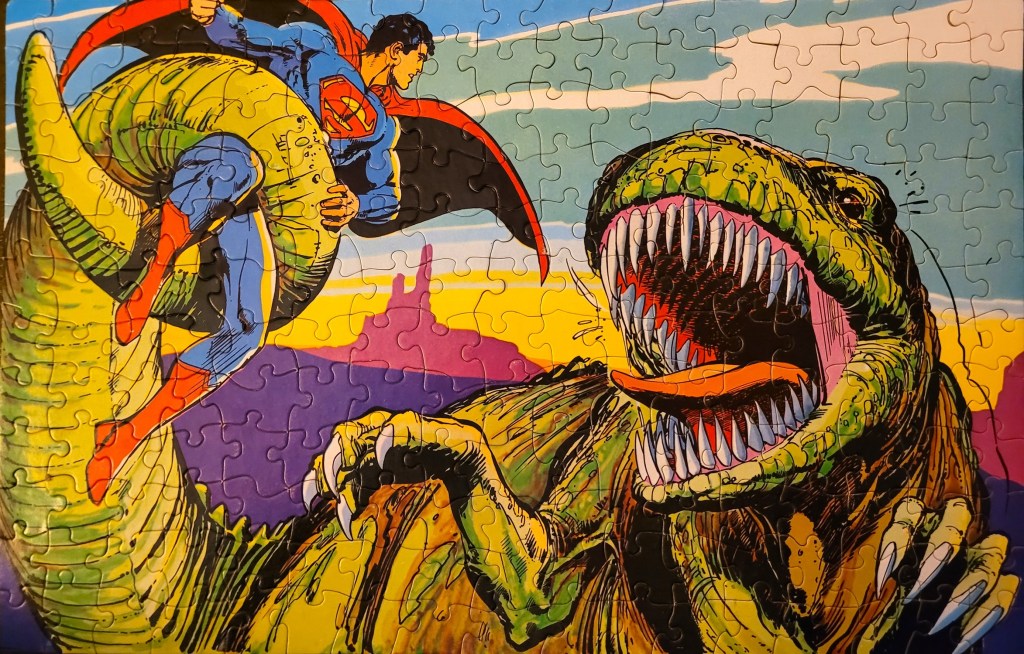 They had this puzzle set aside for me, I guess they had it in their stock for a long time and no one was picking it up, so they wanted to see if I was interested in it. Now, I’ll be the first to admit that I wasn’t interested for the fact that it was a Superman puzzle. I was interested because it was a vintage American Publishing Corp 200 piece puzzle from 1973, and the bonus was the dinosaur, of course.