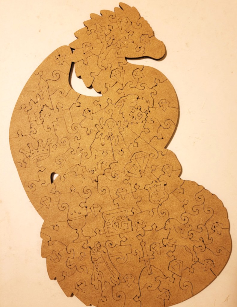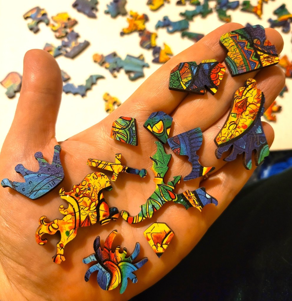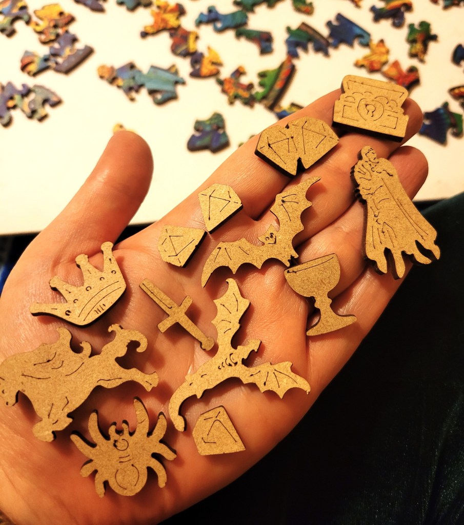 I liked the mythical and medieval themes to the pieces and the piece cut, I felt it was very fitting! I remembered to flip the puzzle over this time around to photograph the back, so you can get an idea of the lovely detail to the piece cut. I especially like how the piece web out from the spider shaped piece.