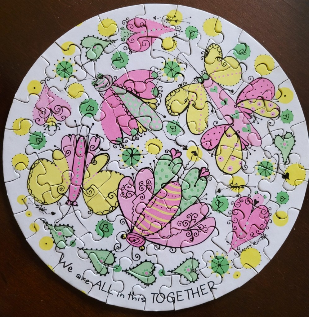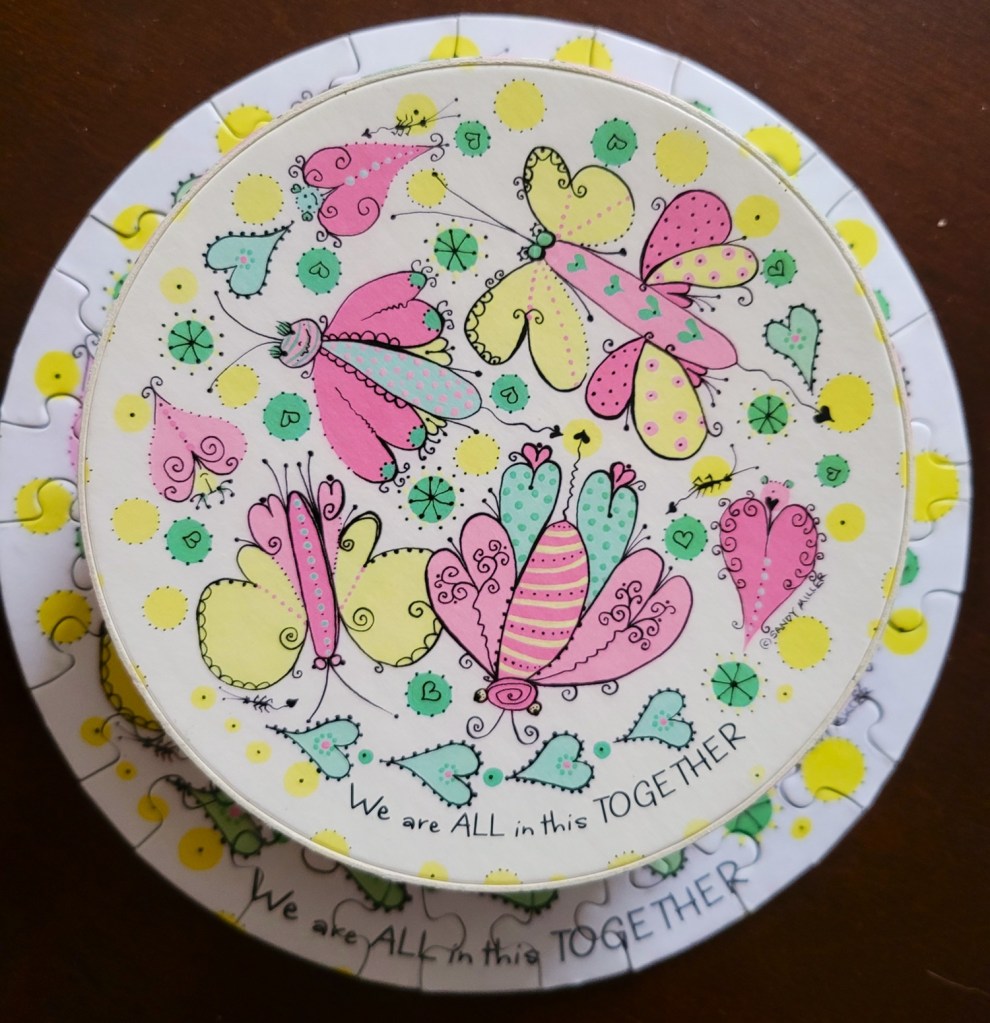 This pastel-hued round mini puzzle is a Springbok release from 2013. Back in the late 60’s, Springbok released these round mini puzzles called Springbok Thingies in callaboration with an artist named Sandy Miller. They were about 60 pieces, came in little round boxes (similar in fashion to their 500 piece count round puzzles at the time) and they featured amazing psychedelic pop art. Honestly, if you look them up, I dare you not to swoon at that artwork. They are stunning, and they are rare, therefore quite expensive. I would say they are a legacy or heirloom puzzle, that is the only way one of them would ever come into my possession!