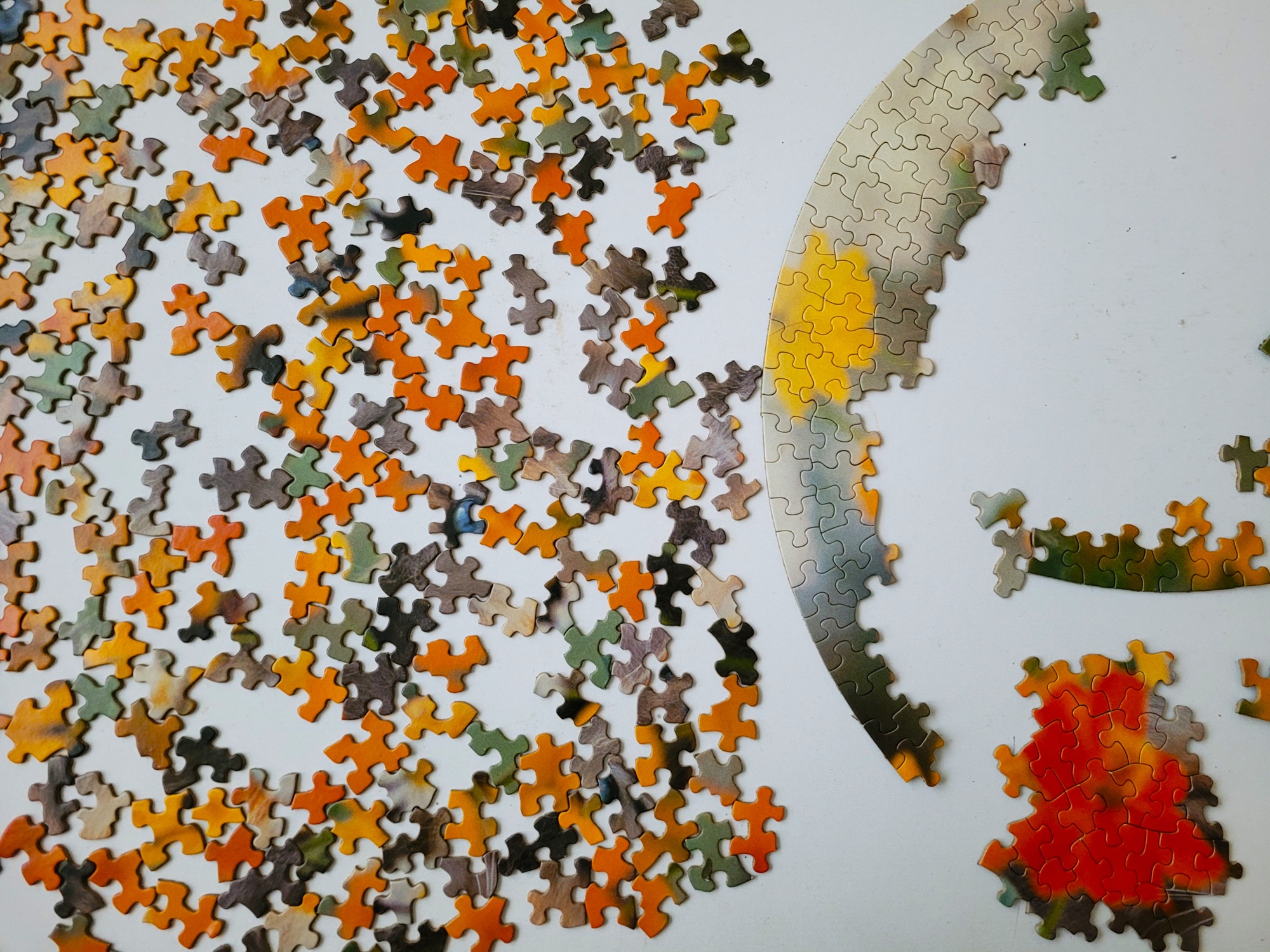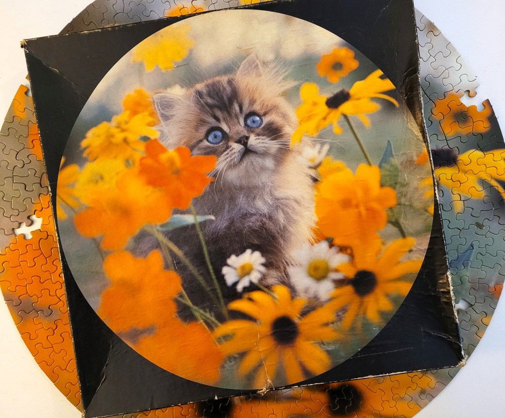 This is just one of those classic round puzzles from Springbok released in the early 80s, this particular puzzle dates back to 1980, she is older than I am! At first I felt a little overwhelmed by all the blurry and furry pieces, but I quickly got over that by grouping distinct colours together.