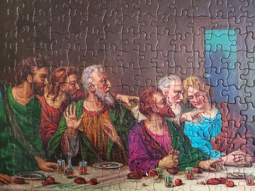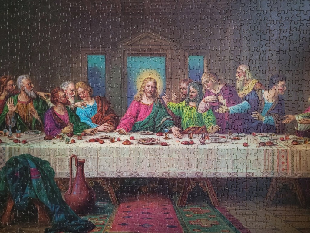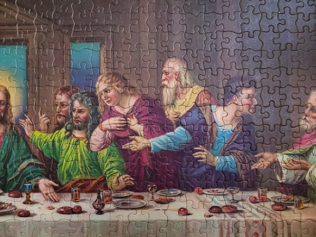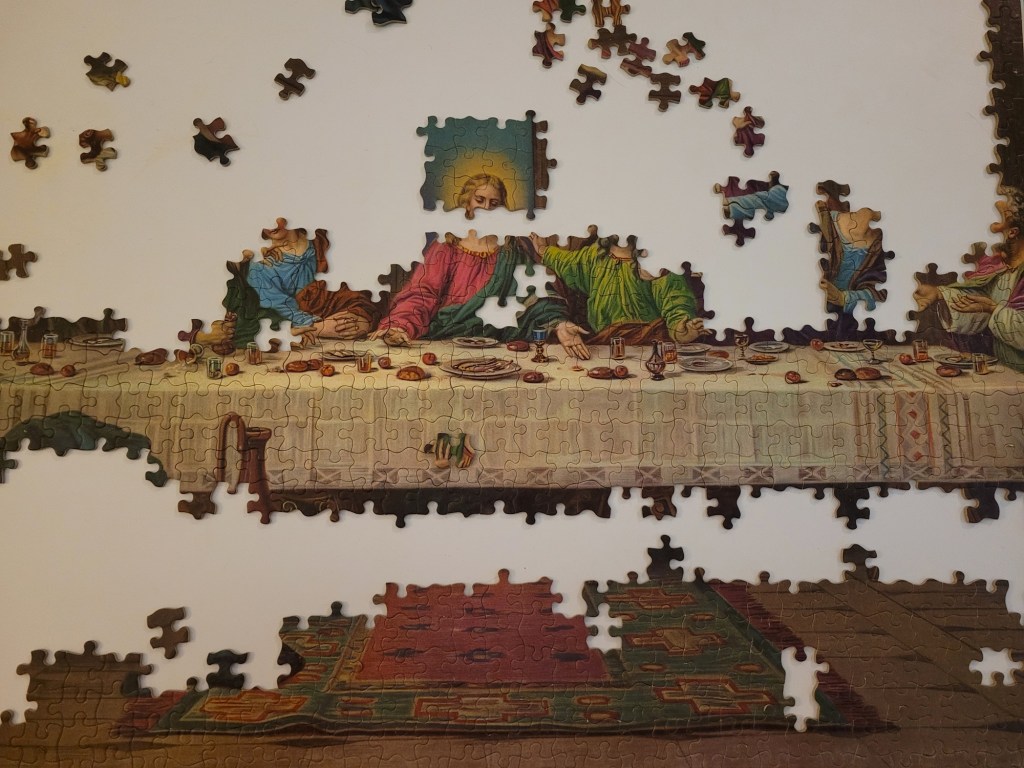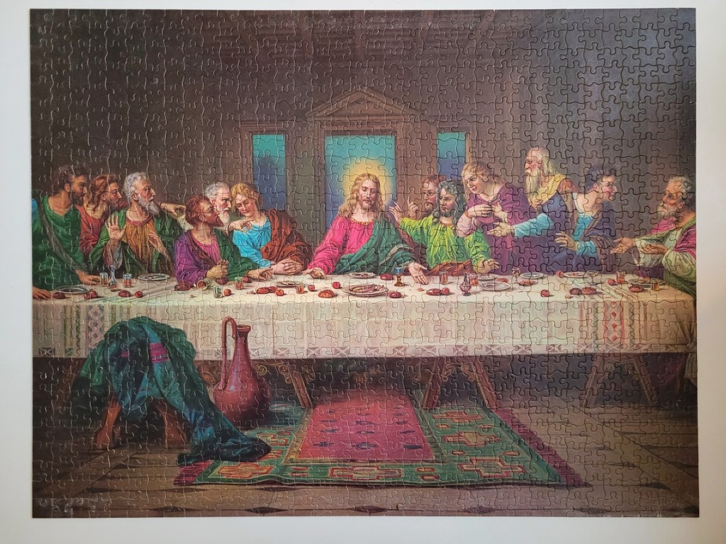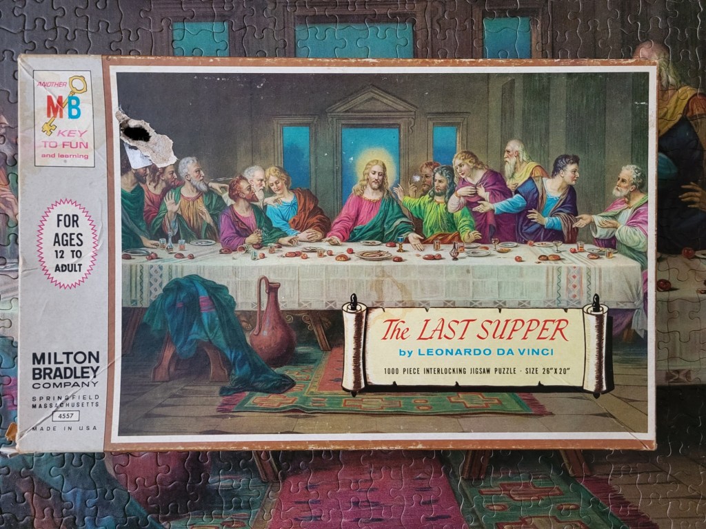 A while ago, my friend Matt actually picked up a vintage Buffalo Games 2000 piece puzzle of the Last Supper for me. He also thrift shops fairly often and when we lived in the same city he would keep an eye on the puzzle collections for me. He thought that I would enjoy the challenge and that I do like to assemble a classic art puzzle. Well, spoilers, I never got too far with that puzzle. The fit of the pieces was so ambiguous that I just couldn’t imagine myself fighting my way through 2000 ill fitting dark brown pieces. So I called it and re-donated it for another brave puzzler to try out.